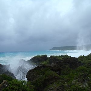 波が遠くの岸壁に当たって数メートルも上空に吹き上がって、