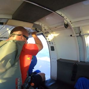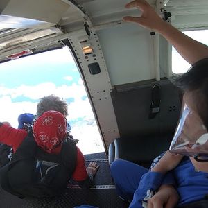 結論、大満足です。セスナに乗り込み、私の飛ぶ順番は3番目。スカイダイビングを、ちょっと軽く考えていた私の目に飛び込んできたのは、開けっぱなしのセスナの搭乗口からみえる下界・・・・こんなに高い・・・心臓がバクバクで・・・最初の人が2,400メートルで飛び出して行った瞬間・・・怖い、ヤバイ・・・次に3,000メートルまで上昇。これ以上・・上がるの?・・・(自分で当日高さをupして、3,000メートルにしたくせに)2番目に飛ぶのは、我が息子・・「がんばって!」と声をかけるのがやっと・・(ここでは、息子の無事を祈る母)