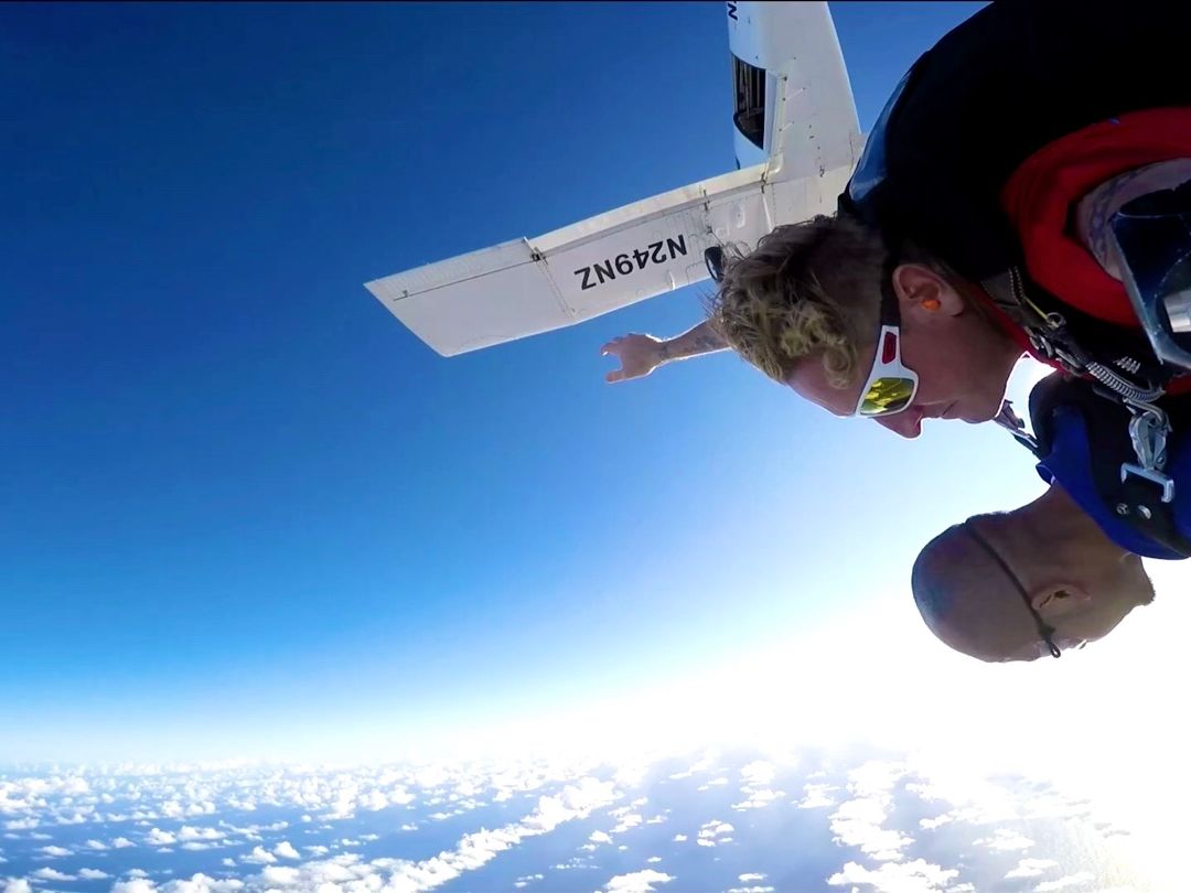 上空まで行っていざ空へダイブする瞬間は、気持ちの整理をしたりする暇もないほどあっという間で、気づいたら空に投げ出されているので、勇気がない人でも大丈夫だと思います。タンデムダイバーのペースで飛び出してます。