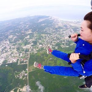 前の人が飛ぶ(落ちる)所を見て余計に恐怖と不安と怖さが来るなか、気が付いたら空の上を飛んでる自分がいて、最初の落ちてる時は風圧が強く腕を動かすことも大変でした!でも、後ろから指示してもらい手を動かしたりして、パラシュートが開いたときに急にスローモーションの様に感じましたが、気が付いたらもう地上❗