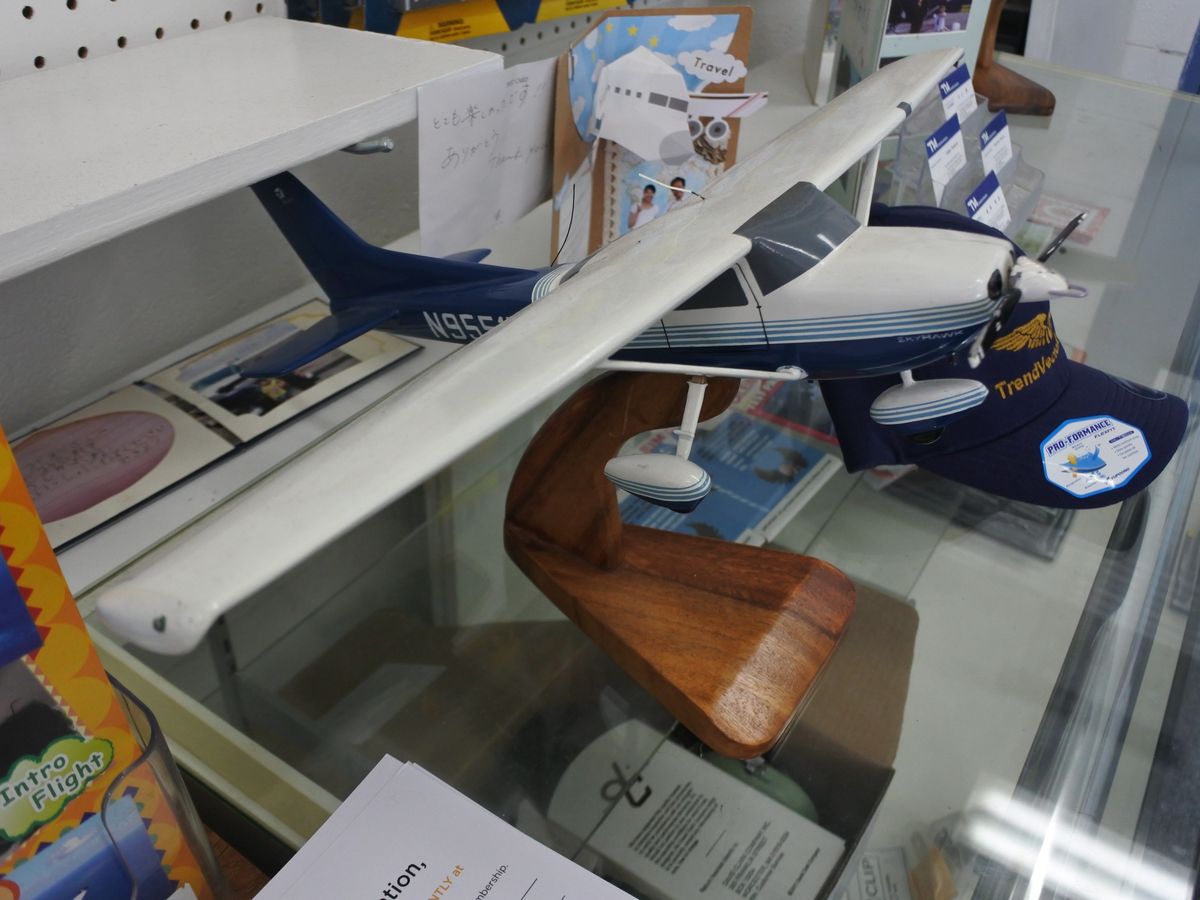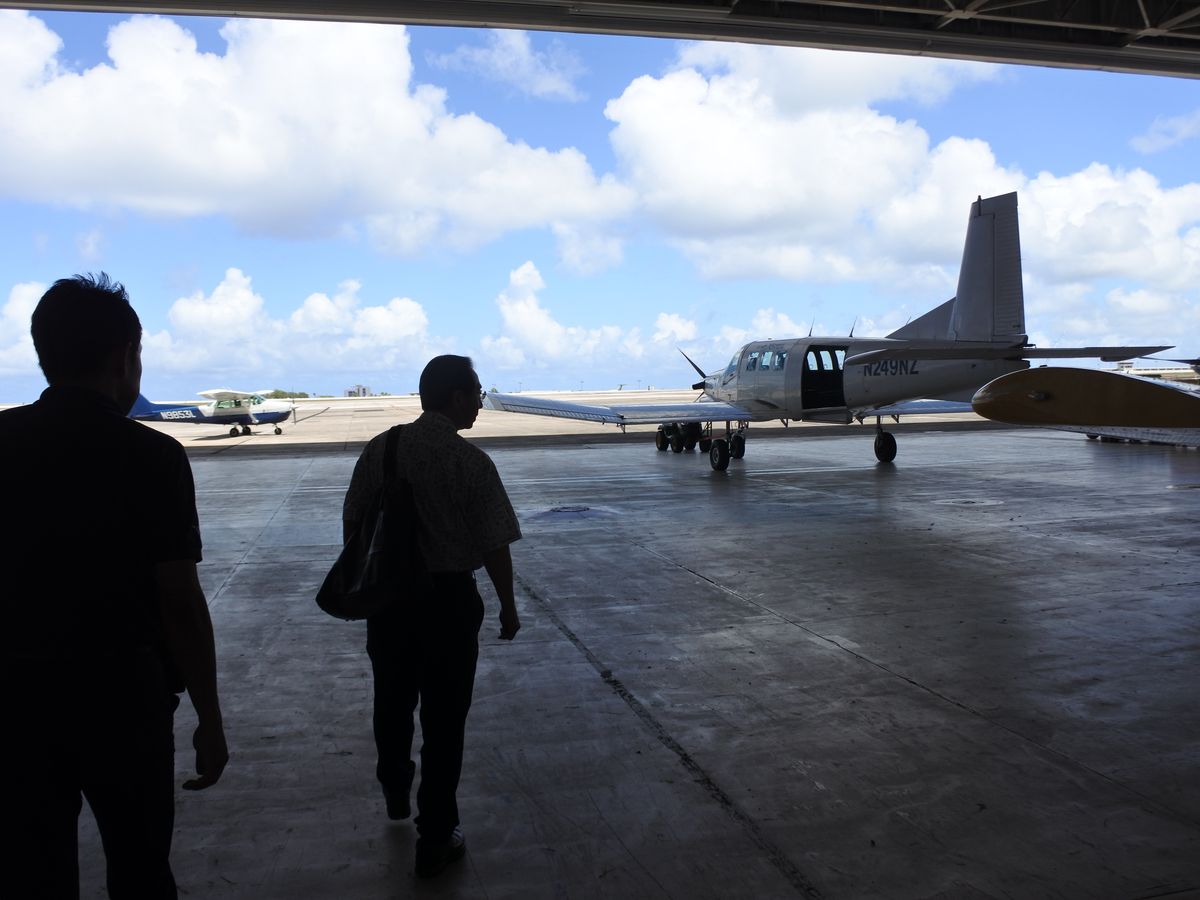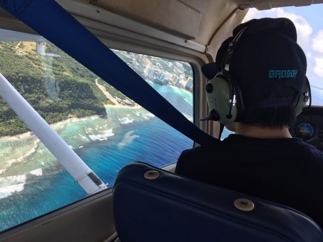 ホテルのロビーで時間通りにピックアップ。旅客ターミナルとは反対側の駐機場へ滑走路をぐるっと回って到着です。20分間の説明ビデオを観終わると川上教官と一緒にセスナへ向かいます。ドアを開けるとそこは格納庫、その先の駐機場に白と青の機体N9853Lが待っていました。この格納庫を抜けて搭乗機に向かう雰囲気がなんとも言えません。機体の説明を一通り受けます。座席に座り位置を調整、3点シートベルトを締めて離陸の準備です。言われたとおりに各種スイッチをオンにしていきます。そして、昔の車のキーのようなイグニッションキーを回してエンジンスタート! いやーエンジン快調いい音です。後はヘッドセットマイクでの会話になります。スロットルを引いていざ滑走路へ。足のペダルで直進するように調整するのですが、これがなかなか難しいです。難しいことは教官頼みです。さあ離陸、スロットルをいっぱいに引いてスタート、ぐんぐんスピードが出て60ノットで少し操縦桿を引けば機体はふわっと上がります。と、飛んだ! 高度600mで水平飛行、そして左旋回してタモン湾へ。とてもいい天気だったので海の色のグラデュエーションが素晴らしいです。何度か旋回を繰り返していよいよ着陸です。言われたとおりにスロットルを少しだけ戻してエンジンを絞り、機種を下げてアプローチに入ります。最後に右旋回して機首を滑走路の正面に合わせて、少し操縦桿を引いてタッチダウン!そのまま格納庫へ向かい体験操縦終了です。あっという間でした。セスナ172はとても安定性のよい機体でした。しかし、安全に飛行するには離陸準備から着陸まで、実際にはとても多くの手順があります。また、飛行中にも細かい調整をする必要があります。これらを全て教官が行ってくれています。だらか私たちは安全で楽しい体験操縦ができると思います。川上教官ありがとうございました。次回はいつ飛ぼうか考えながら帰国しました。