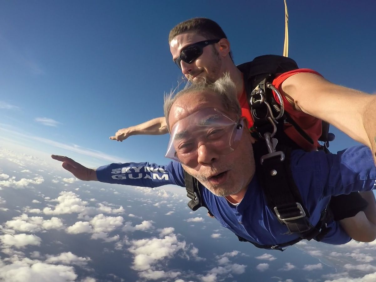家族でグァム旅行計画中、娘にスカイダイビングやってみるかと冗談半分で聞いたところ、絶対やりたいとの回答でようやく現地入り。スタッフの方からも日本語で丁寧な説明を受け嫌がる妻をようやく説得。どうせやるなら4200mからのダイビングで家族3人で初挑戦。タンデムマスターと対面しお互い自己紹介、和やかムードでセスナに乗り込みいざ出陣。上空から見るグァム島の景色は最高。そうこうするうちダイブポイントへ。怖いと思ったのはダイブ直前下を見下ろした瞬間だけ。あっという間に重力のなすがまま落下。ものすごい風圧にもかかわらず素晴らしい景色に感動のあまりガッツポーズ。パラシュートが開いてからの眺めも最高でした。無事地上に到着し家族も興奮状態覚めやらず。今まで自分の悩みや存在がいかに小さいものであった事に気付き、これまでの人生の中で最高の思い出となりました。最後にタンデムマスターのボビーはじめその他の方々本当にありがとうございました。人に夢を与える貴方の仕事を誇りに思います。又、危険な仕事であるが故、遠い日本から皆様の安全を祈念致します。