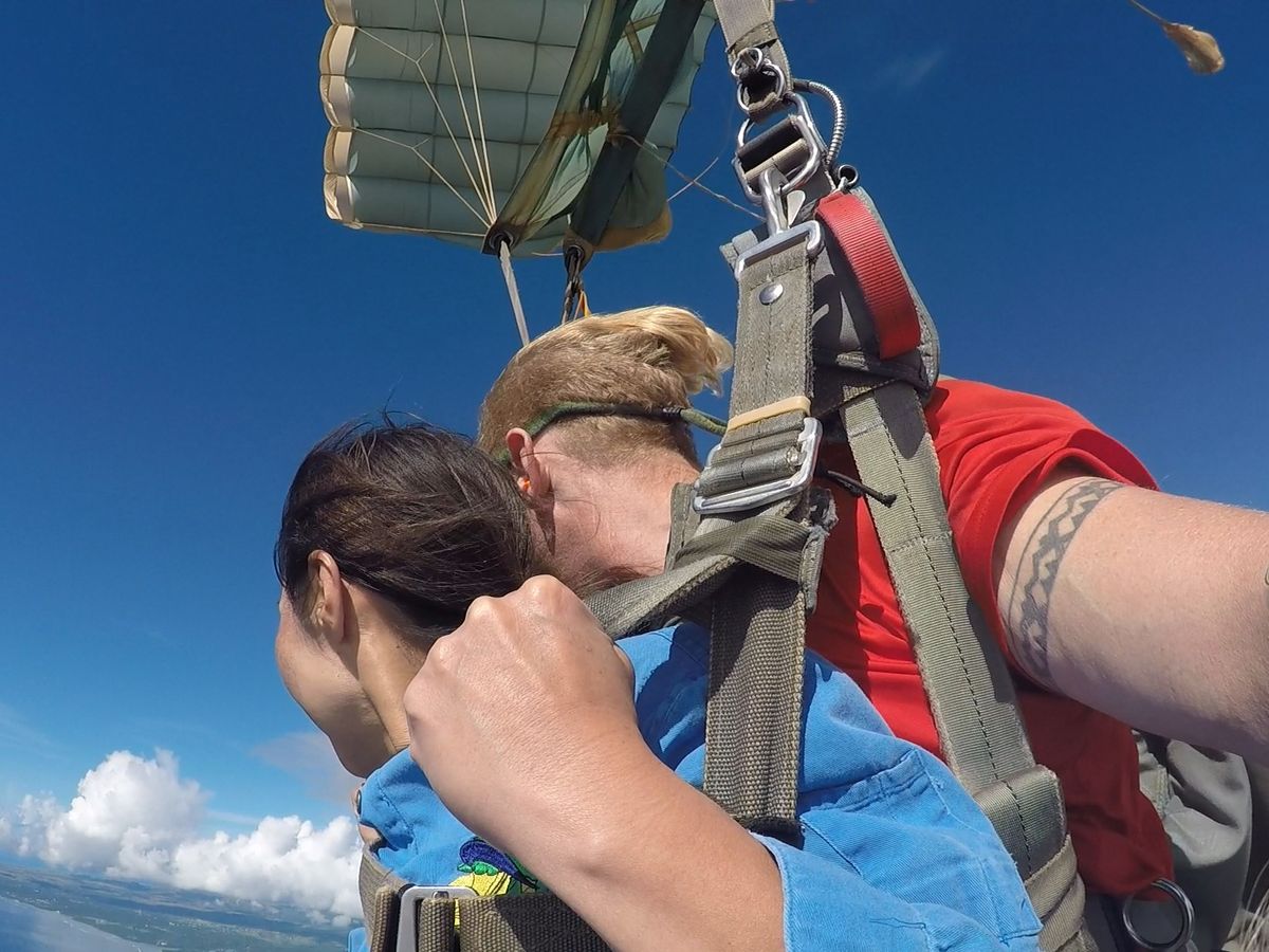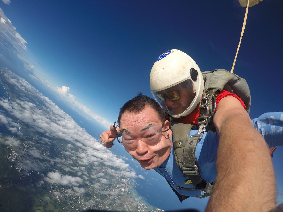 機内はインストラクターがずっと英語で仲間と話しているので何がなんだかわからないうちに上空へ到着し、あっと言う間に押し出されてダイビングしてました。