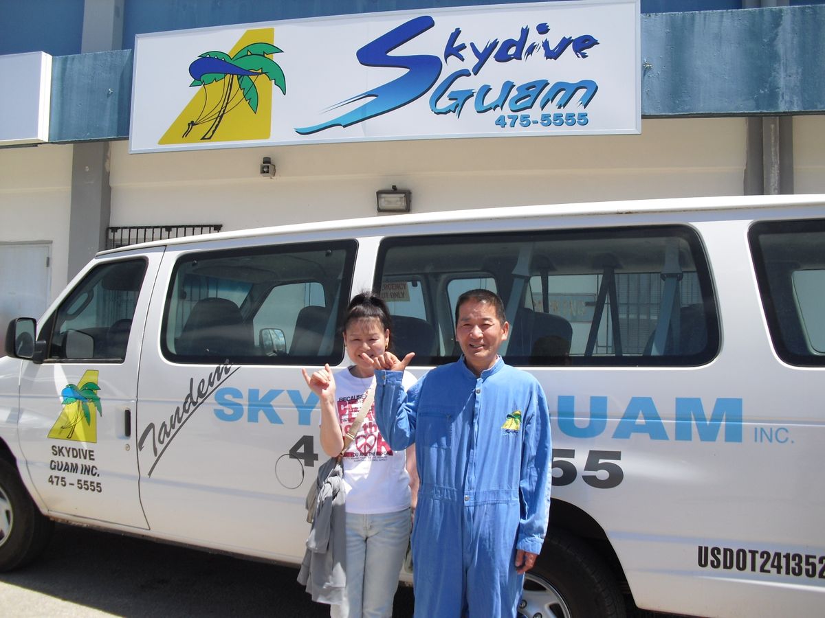 私は64才と7ヶ月でチャレンジ。迎えに来た青年は私が近寄っても目を合わせてくれず他の人ばかり探す様子でした。目の前に行くと、信じられない仕草でYou are skydivingと尋ねられYesと答えるとオゥと親指を立てられました。事務所に付くと三つ編みの可愛い日本人スタッフの説明を受け署名を済ませ、つなぎの服を着ていざレッゴー。天気も気分も絶好調。高度がグングン上がりグアムの島が一望でき景色は最高!大空に向かって飛び込む瞬間とフリーフォール!50秒位が最高に楽しかったです。パラシュートが開くと同時に体がど~んと持ち上がり気分はローに…酔いやすい人にはパラシュートが開いてからの方が大変かも(笑