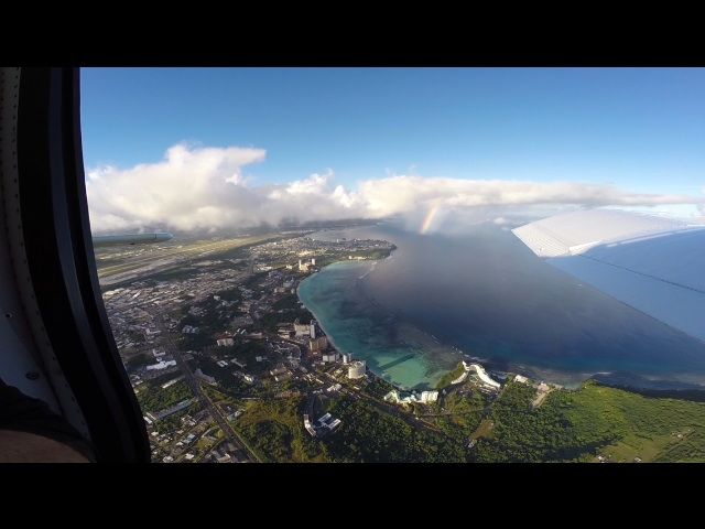 友達とショートコースに申し込んで参加しました。承諾書にサインの後、10分程度の飛行解説ビデオの中で、当日のコース変更も利用状況により可能との事だったので私はココス島まで回るコースに変更。機体の準備が出来ているので即搭乗。友人も後部座席に同乗し、グアム国際空港から離陸。恋人岬に向け旋回、高度500mを維持した操縦を存分に体験後、グアム国際空港に向け着陸態勢、後方にはデルタ航空の旅客機が着陸順位2番で私の後方を着陸灯を点灯して向かってくるのが見える。体験操縦でも着陸順は差別無いのに驚き。教官は操縦桿にほぼ手を触れず無線交信以外はほぼ自分だけで操縦させてもらえるのが素晴らしかった。