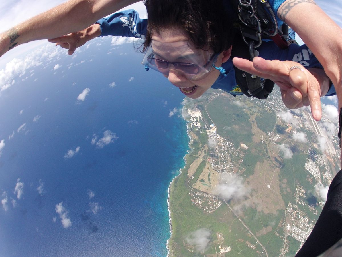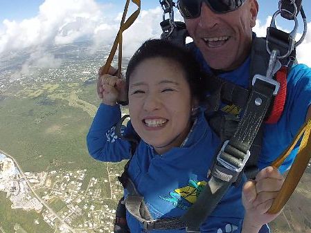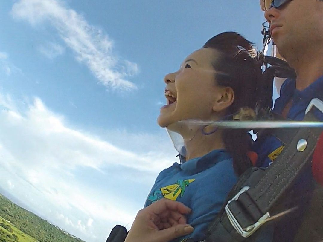 一緒に飛んでくださったダイバーさんはとても気さくに話しかけてくださり、緊張も溶けました。フリーフォールはあっという間ですが、パラシュートが開いてからいろんな方向に飛んだり、雲の中に入ったり、グアムの空を大満喫できました。2400mからでも十分楽しかったのですが、次回は4200mからも挑戦してみたいです♪