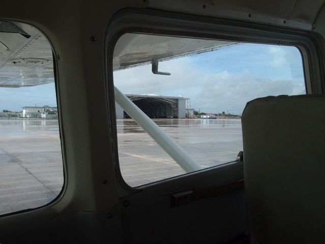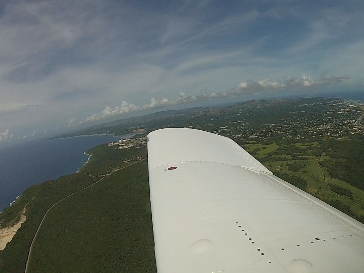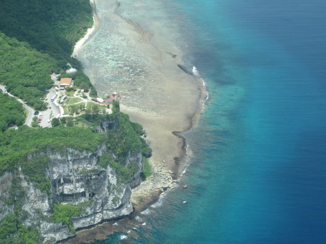 当日、深夜3時過ぎに滞在ホテルに到着して、フロントからリコンファームをお願いしたら留守電はなく不在のため、朝もう一度電話しなくては、と思っていましたが、母と二人でバタバタとしていたら約束の7時を少し過ぎてしまいましたが、スタッフさんが、ロビーでもうすでにお待ちになってくださいました。空港へと迎い、途中、立ち入り許可証の札を着けて、事務所で署名にサインをして、セスナに乗り込みました。滑走路まで行き、徐々に500メートルの高度まで上がり、水平飛行になり、タモン湾を眺め、恋人岬の方までぐるっと近付いていき、アガニャ湾とアガニャの町をご紹介してくださり、はるか下界に海中展望塔が見えました。海の色々が見事に見えてたくさん写真を撮りました。