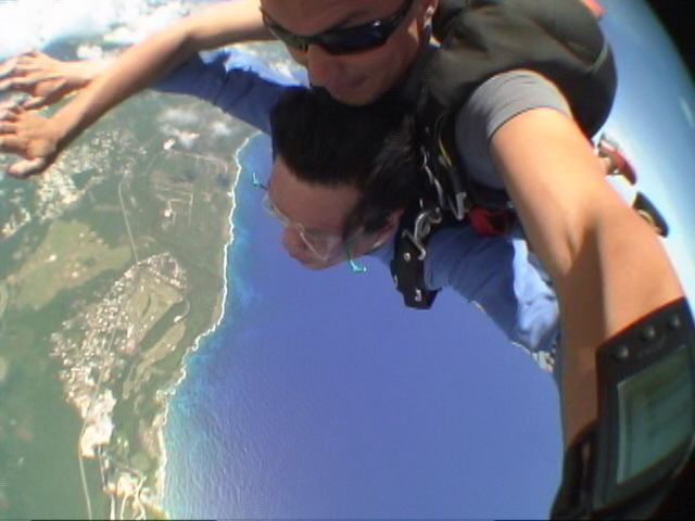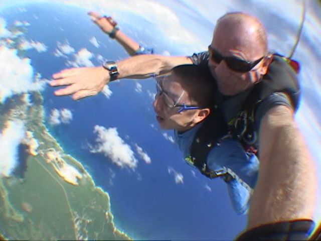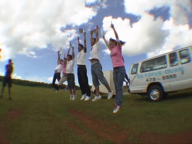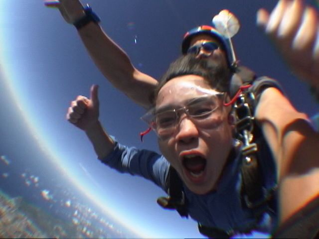 4200mで約1分のフリーフォールはアドレナリン全開です!!僕は時速200kmで飛んでるスーパーマンになれました。パートナーのボビーがついでにきりもみ旋回してくれて、もう最高のテンションでした。グアムの景色が自分中心に大回転してました。そしてお約束の空中平泳ぎもしました。