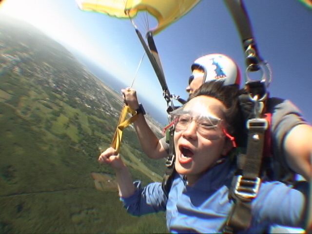 ここから、世界が変わって!すごいスピードで、落ちないのです!なんか浮いてる!あれ?なんか変?そしてものの1分ぐらいしたかしないか?でパラシュートが開いて。。そこからはふわーり、ふわーり。地面が近づくと、あーーもう終わり?って。