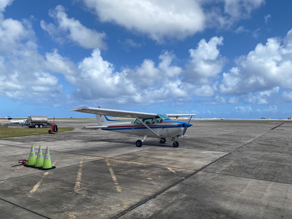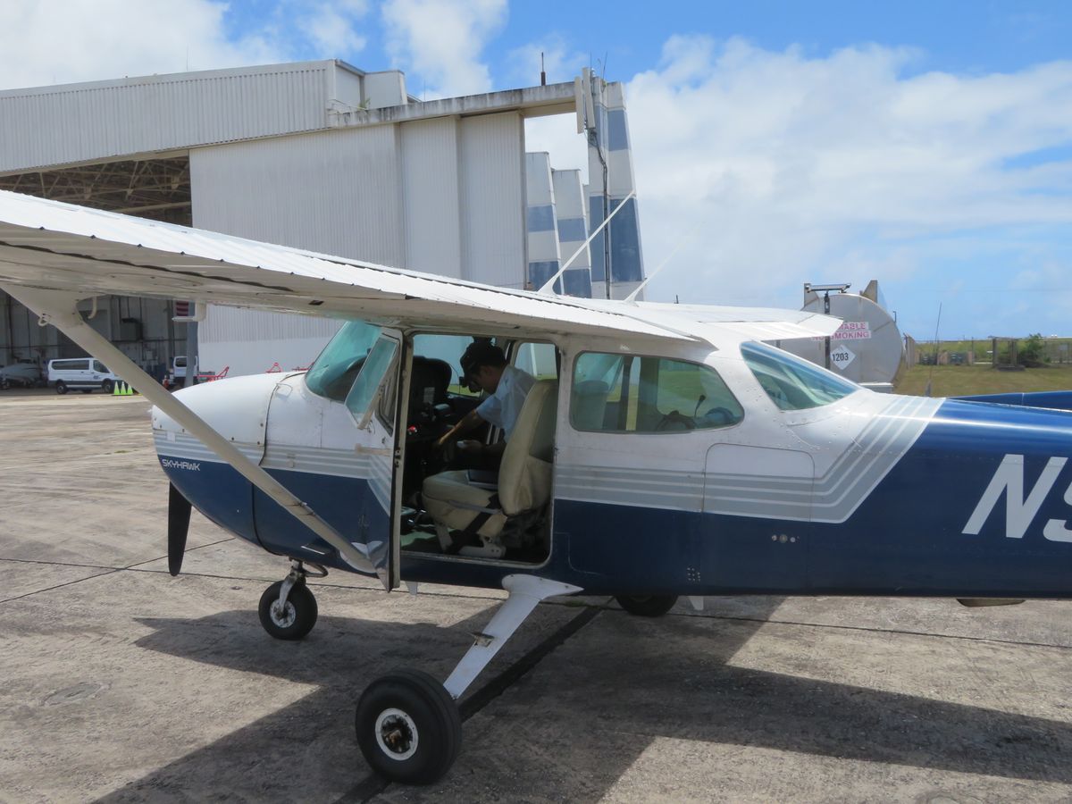 時間通りにホテルから送迎いただき、グアム国際空港南側の格納庫内のオフィスで、操縦方法のビデオ視聴して航空機に向かいました。日差しが強く、航空機には冷房は装備されていないので、サングラスと汗をかいても大丈夫な服装で参加することをおすすめします。
