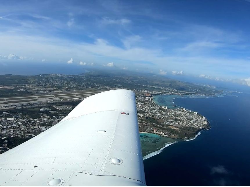 その後昼前に雲が去り、多少の雨もところどころ降っていましたが、グアム国際空港06Rを飛び立ち、右へ旋回して島の南東部の訓練空域へ移動。そこで45度急旋回、上昇失速回復、上昇8の字旋回、円旋回を雲を避けつつ行い、06Rでタッチアンドゴーの後にフルストップ。大変満足のいく内容でした。