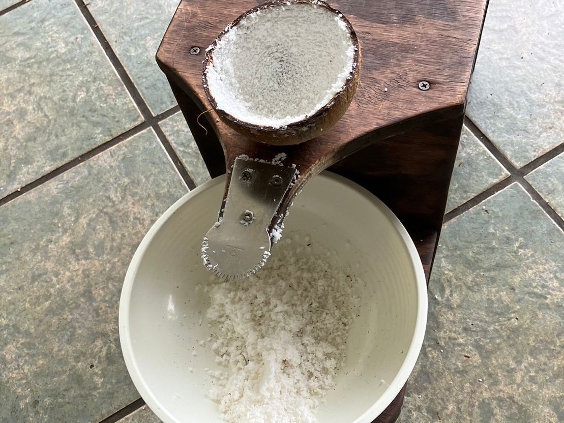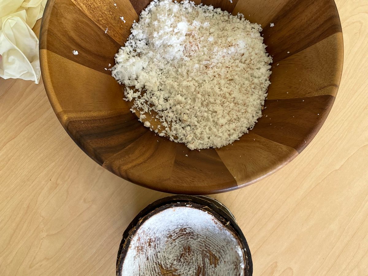 削ぎ落としたものを、ふきんで絞り、ココナッツミルクが完成。