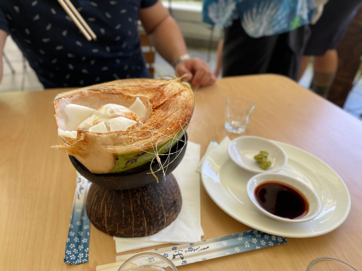 ただ残念だったのは、昼食が、室内ではなかったことです。橋から戻る時にとても暑いので、冷房の効いた室内でいただけると思っていたのに、ココナッツ体験をした屋根付吹き抜けの場所でした。汗をかきながらの昼食なのと、ココナッツジュース、お刺身、コーヒー、プリンをいただいてから2時間も経っていないので、全然お腹が空かず、ほとんど食べられませんでした。
