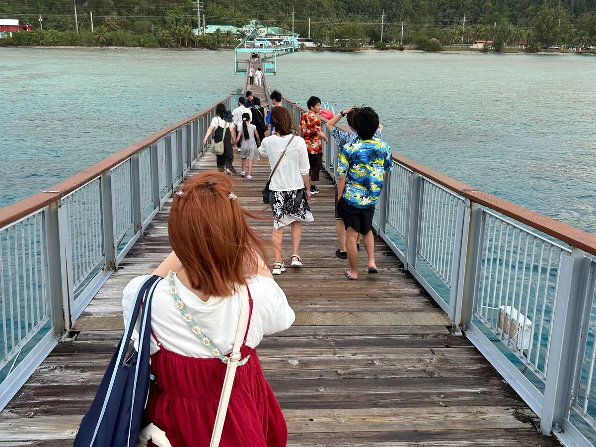 ココナッツ体験が終わると、海中展望塔見学を行いました。グアムの綺麗なエメラルドグリーンの海の上の橋を歩きながら展望塔まで移動しました。お天気も良かったのでとても写真映えするスポットでもありました。いざ展望塔の中に入ると、らせん階段になっておりワクワクしました。窓からは海の中にいるいくつかの魚を見ることができました。また、シュノーケリング体験をしている方がたくさんいたのでその人たちに手を振って、振り返してももらえました。最後に、プラスアルファとしてランチをつけたのですが、そちらでも楽しむことができました。オプショナルツアーには日本人の方が多かったり、家族連れが多く参加していたりと子どもから大人まで楽しめるものではないかと参加して思いました。ホテルまで行きと別のスタッフの方が運転してくださったのですが、こちらの方も日本語がお上手で、息子さんが私たちと同じような世代であったためかお父さんみたいな雰囲気で話してくださいました。