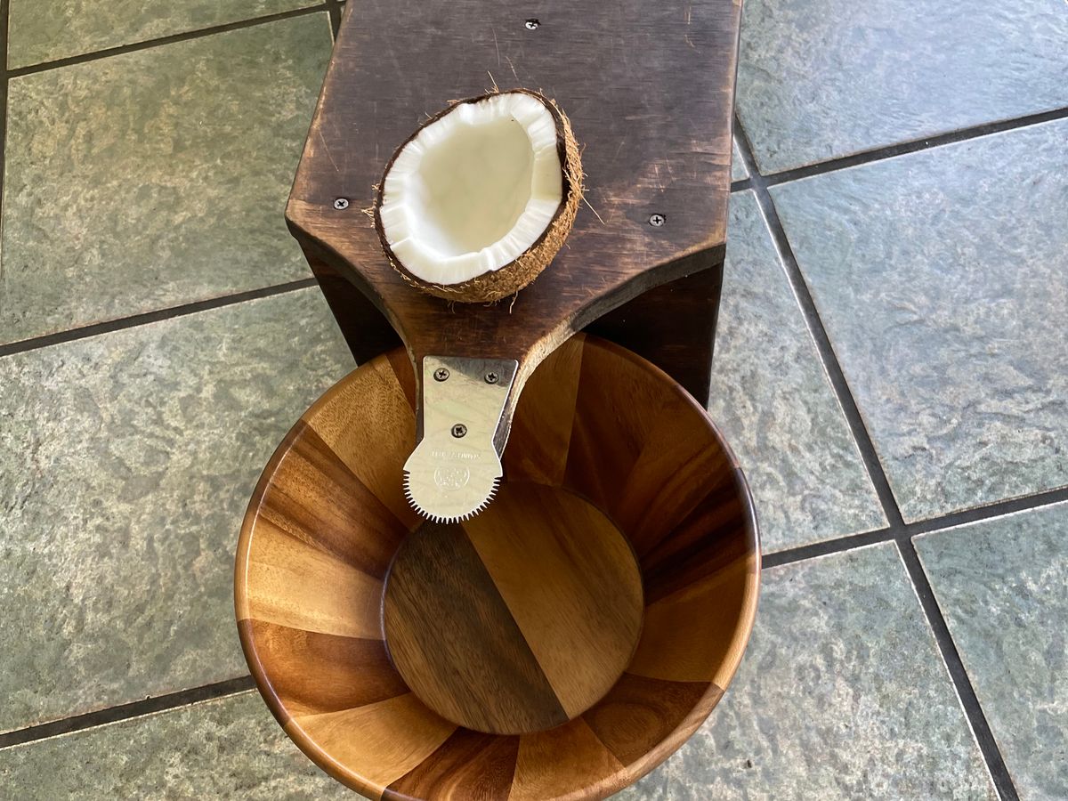 その後、ココナッツの実を専用の機械で削り取り、ミルクを絞る体験をしました。
