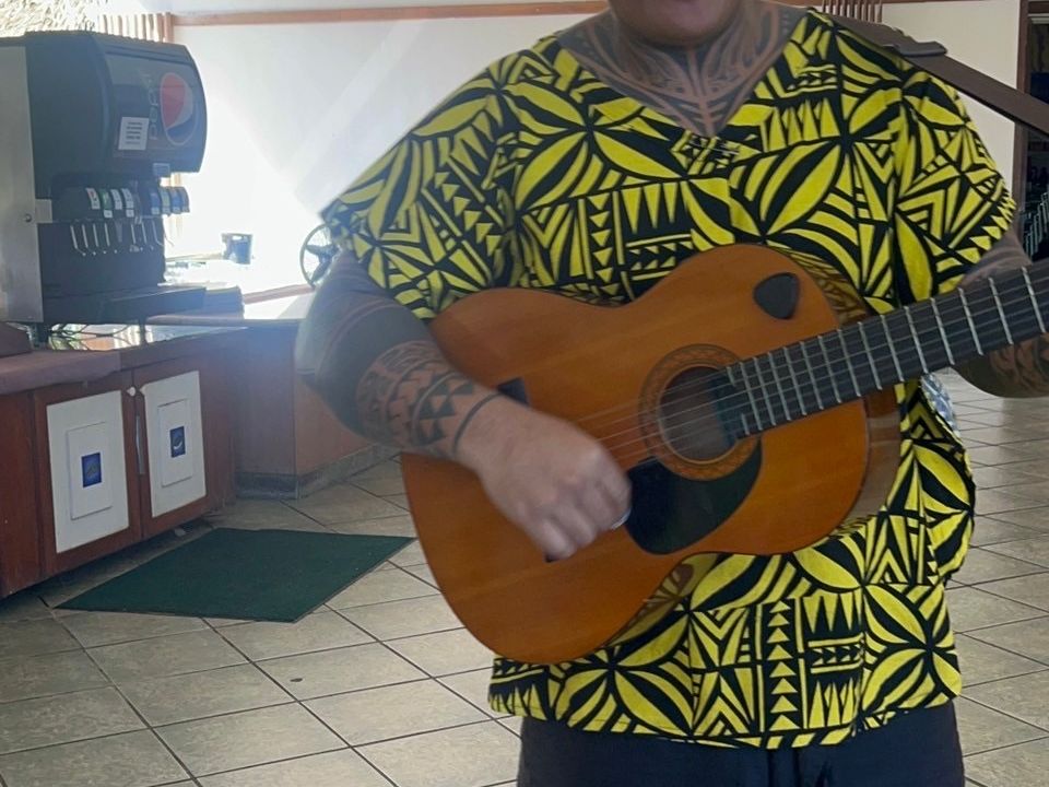 まず、スタッフの方が朝8時50分にホテルまでお迎えに来てくださいました。スタッフのエドワードさんが運転してくださっていたのですが、この方はいろいろ話しやすい雰囲気を作ってくださり会話を楽しむことができました。エドワードさんは日本語がとてもお上手で私はとても驚きました。どのくらいの期間グアムに滞在するのかという簡単なことから、グアムでのおすすめの過ごし方などいろいろな話題がでました。いつのタイミングかは忘れてしまいましたが、私たちは3月31日に帰国するのにもかかわらず、「来月また来てね。」とおっしゃっていて、とてもおちゃめな方だなとみんなで笑ったのを覚えています。施設に到着したら、スタッフの方がウクレレを弾いて出迎えてくださいました。その後すぐにココナッツ体験に参加しました。ココナッツは果物という固定観念があったため、まさか、醤油につけて食べたり、わさびと合わせてわさび醤油で食べたりするという食べ方になるとは思っていなかったです。イカのような食感になるとおっしゃっていて、食べてみるとたしかにイカのような感じがしました。その後は、ココナッツを自分たちで削ってみたり、削ったココナッツを絞ってコーヒーに入れて飲んでみたり、マンゴープリンと一緒に食べたりと、ココナッツの今まで試したことのない食べ方でいくつか食べました。ココナッツの中身は飲むことができ、食べることができ、外側の殻は器になったり、アクセサリーになったりとさまざまなものに変化するココナッツについて知ることもできました。