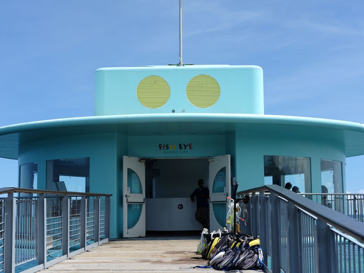 バスでフィッシュ・アイに向かうこと約15分。到着すると日本語で丁寧な案内があった後に自由行動。海にかかる橋を渡り海中展望塔へ入ります。展望塔の階段は螺旋階段です。足の不自由な方には難しいと思いますが、一般的にはさほど疲れる感じではありません。