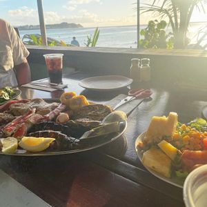 あいにくの雨で、海際の席だったので何度か強風と雨が入って来ましたが、止んだり降ったりが8月のグアムなので仕方ないかなと。ただ、絶景を見ながらという訳には行かなかったですね。夕日を見ながら食事が出来たら最高だったのにとそこだけ残念でした。食事は家族3人で肉と海老・蟹と牡蠣のコースにしました。お肉は牛・豚・鳥が1人1枚づつなのでかなりのボリュームです。それに加えて海鮮も3人分しっかりあるので、これでもかというくらいの量です。サラダとご飯とお味噌汁とデザートはバイキングで、何が1番ホットしたかと言うと味噌汁でした。濃いめで美味しくて何回もおかわりしました。海老と蟹は特に美味しかったです。お肉は焼き過ぎると硬いので注意です。缶ビールも飲み始めて直ぐに次のビールを席に置いてかれたので、好きな方は良いですが、少しだけという方はキチンと断ってください。トイレも娘1人で行かせるのは不安でしたが、女性スタッフが女子トイレと男子トイレの間に立っていてくれるので安心でした。お腹いっぱいでしたが気持ちのいい接客で楽しい食事ができました。