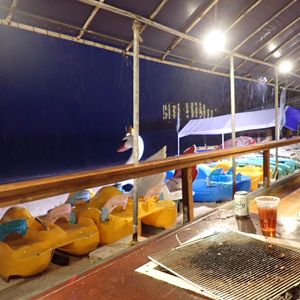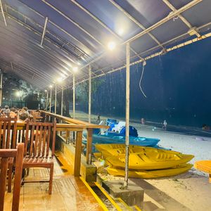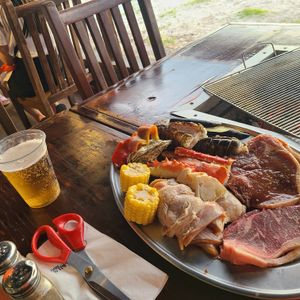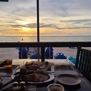 ロケーション最高の一番浜寄りの席に案内されました。自分でテーブルの網にのせ焼いて食べるスタイルです。ボリュームも有りましたが、海鮮類は全体的に解凍した感じの、しょぱい味が強いです。味よりサンセットを楽しむ場所としては最高でした。当然、炭火なので髪の毛や服に匂いはつきます。