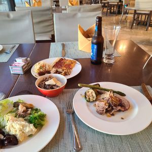 ステーキを食べたかったので写真を見てデザートもありお値段も他のステーキ店に比べてお安かったのでヒルトンのディナーを予約しました。がステーキはまだ焼けてなく焼けてステーキのところにいってみるとどう見てもソーセージ、ソーセージをステーキというのかとがっかりしました。品数は沢山ありましたが私たち夫婦には食べるものがなくケーキを少し食べ20分程でお店を出ることにしました。