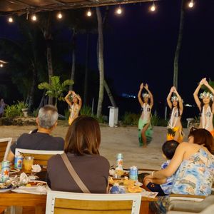 ビュッフェは1番下のランクにしましたが、お肉も柔らかく十分な量でした。ドリンクは別料金なので注意が必要です。子どもはビュッフェ台にあるそうめん、フルーツ、サラダ、最後のアイスを気に入って食べていました。ファイアーダンスももちろん、最後はゲストも一緒になってダンスをするのが最高の体験でした。夕日もきれいで、日本人スタッフの方に家族写真も撮っていただけました。