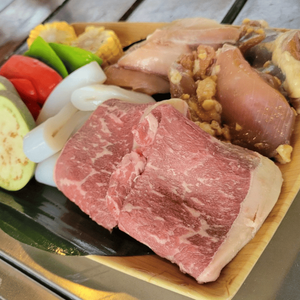 バーベキューは肉と魚介類と野菜の盛り合わせで、一人前のボリュームが
