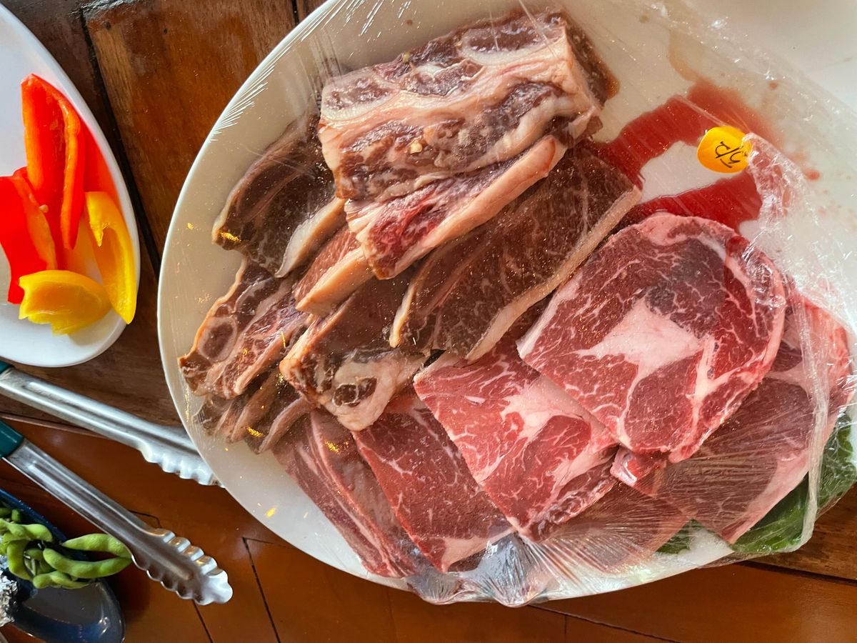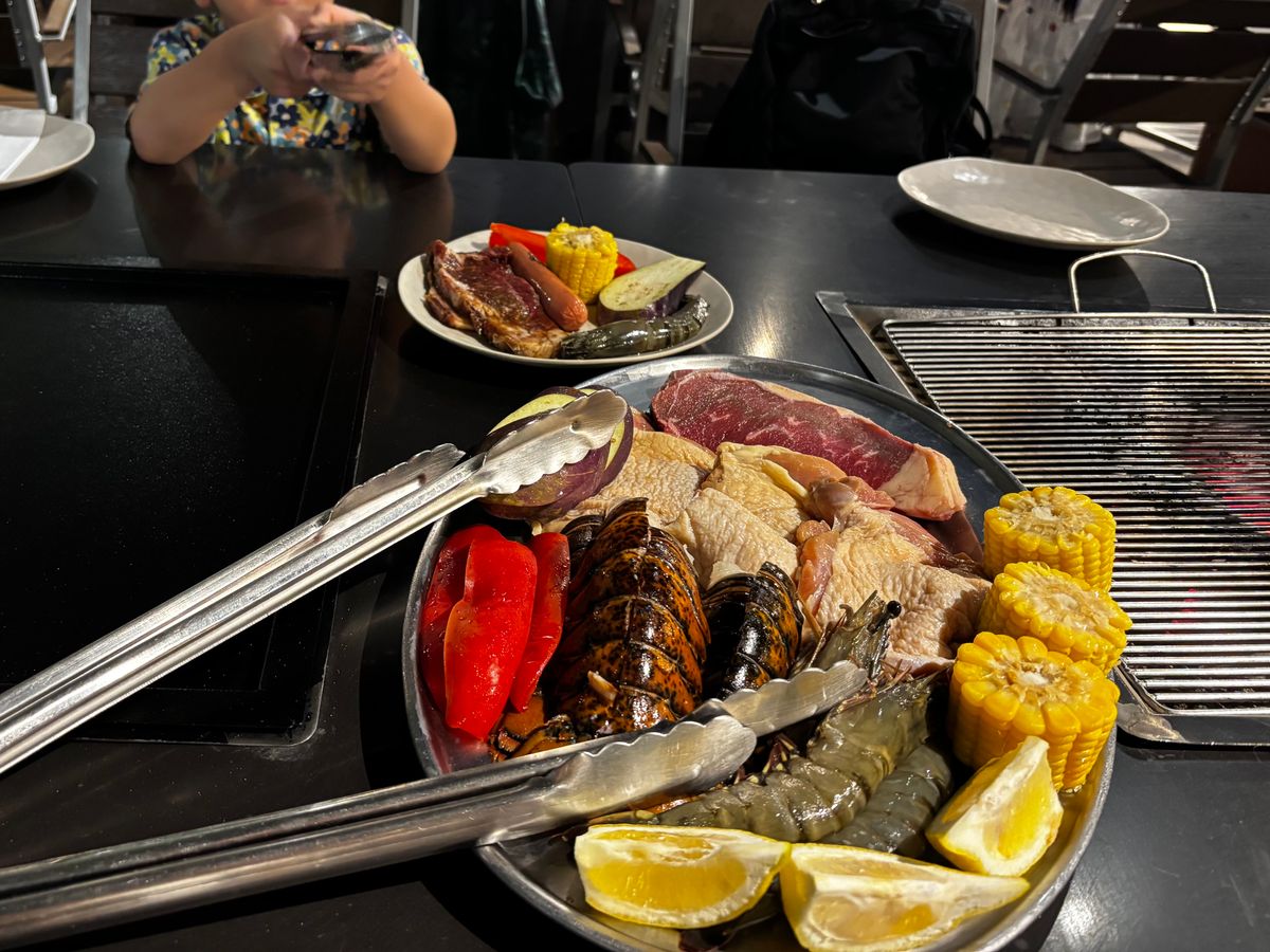 150gのビーフが4枚もあり、それだけで満足の上、いか、えび、骨付きカルビ、チキン、フルーツ、そうめんなど食べ放題になっており、最後にはいちごアイスまで配って下さり最高でした。