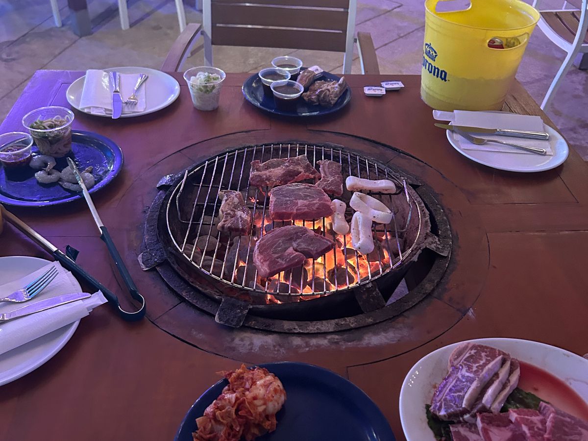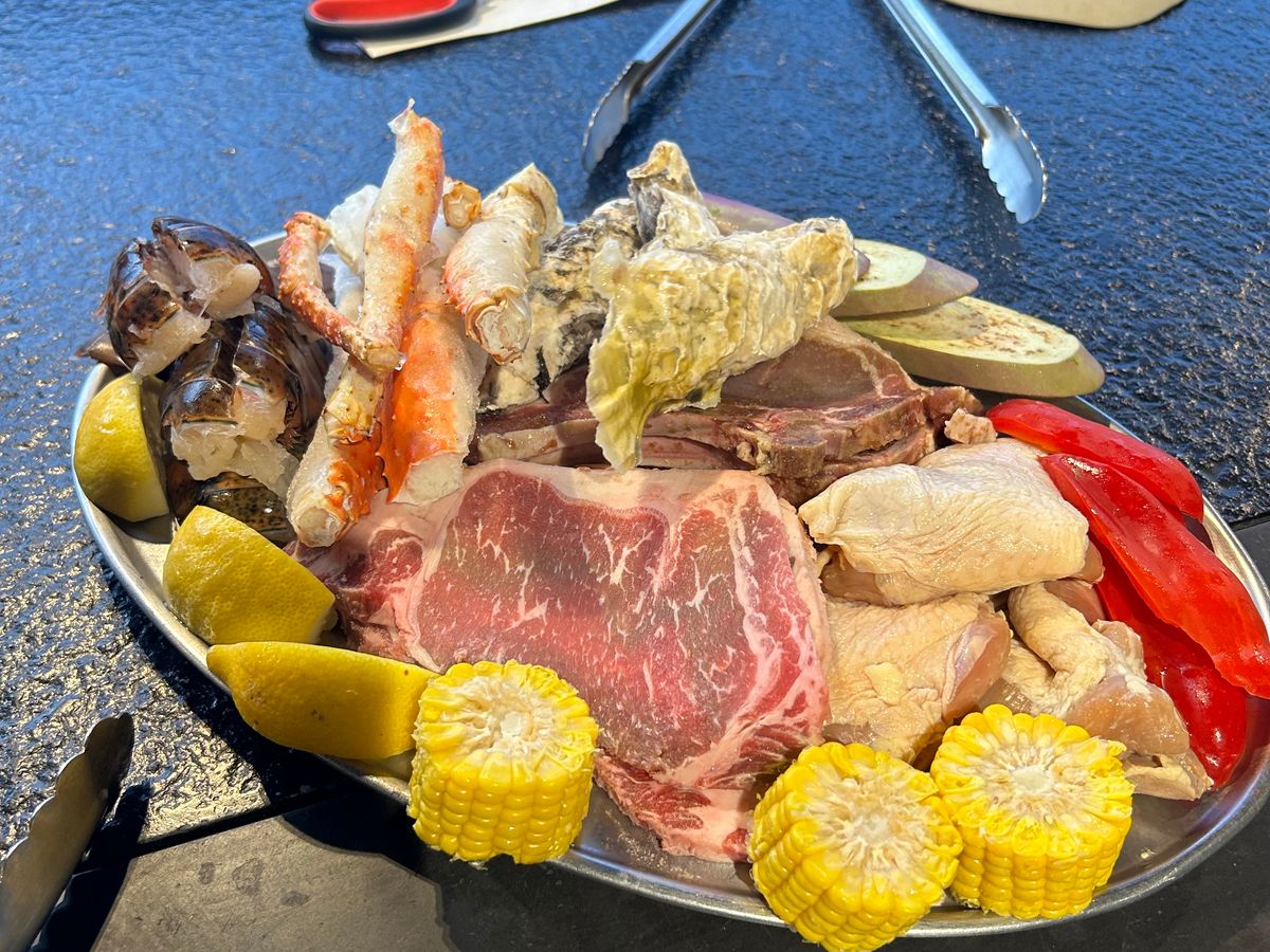 大人5人で行きました。2テーブルになるのか、1テーブルでいけるのか、不安でしたが1テーブルでした。参考写真からはわからなかったので1テーブルは満足しています。肉、カニ、エビの味は最高です。量も多いので、10代、20代が4人いて助かりました。60代の私には多すぎです。味噌汁がわりのスープも私にはうまかった。3杯飲みました。最後にチップが必要なのかわからなかったが、ここで予約した人は不必要とわかり大変楽でした。