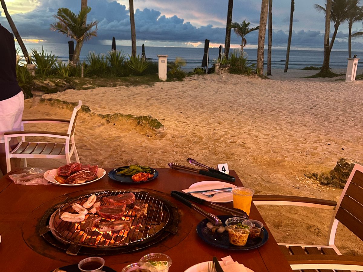 海を見ながらのバーベキュー最高でした。大きなお肉やシーフードなど食べきれない食材をみんなで楽しく頂きました。最高の思い出になりました。残念ながら、曇りでサンセットが見れませんでした。