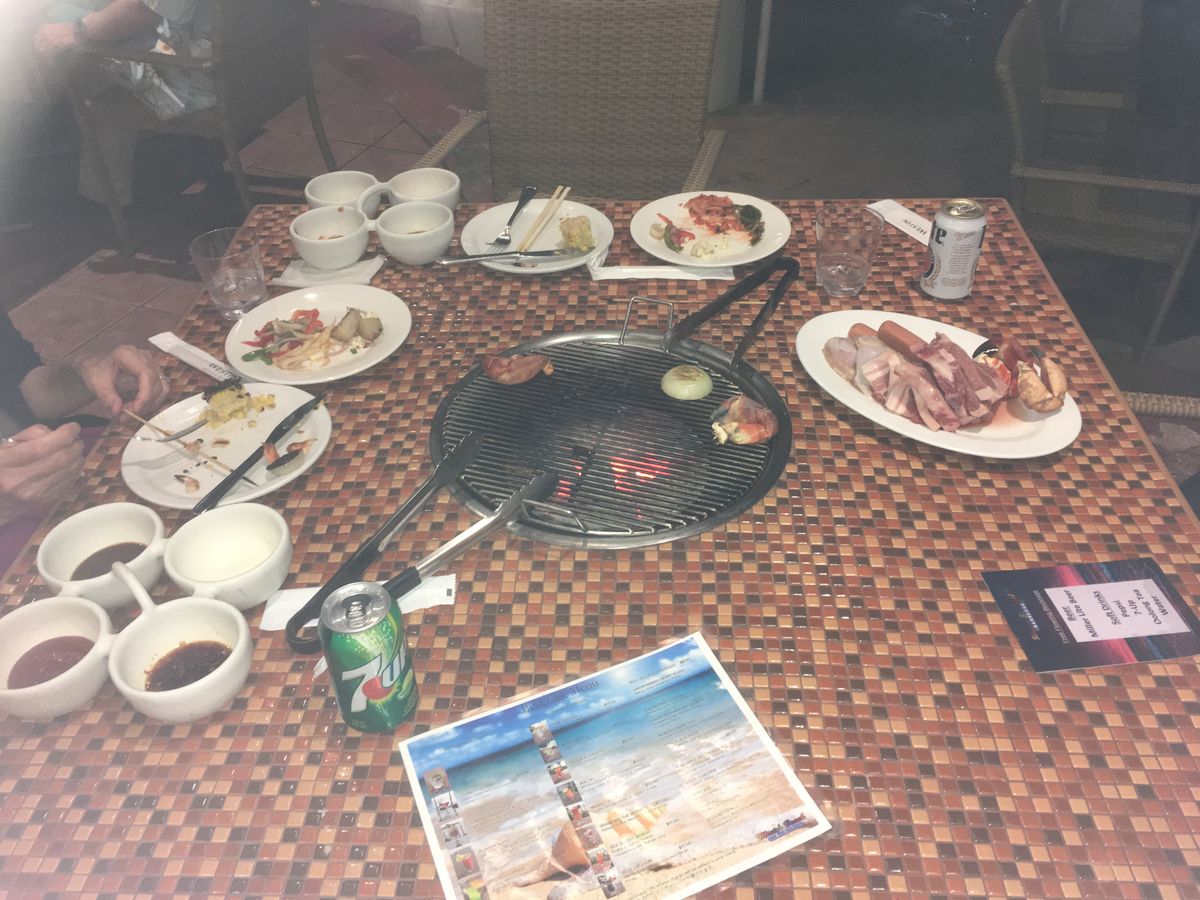 お肉類はあっさりと大味ではありますが、炭火で焼くと脂も少なくなりおいしくいただけました。ソース類も用意されているので物足りない方はそれを付けてもよいですね。バイキング形式の料理は、日本・韓国向けの味付けのものを色々とそろえてありましたが、まあオマケ程度かなと思います。野菜もおかわり出来るようになってたのは良かったです。アイスクリームやフルーツもありました。沢山食べたい方にも満足のいく内容なのではないでしょうか。