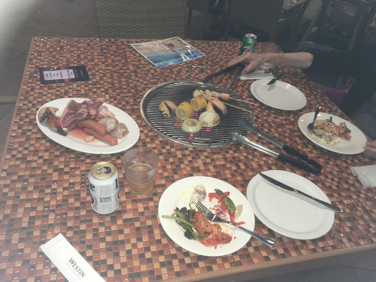 ウェスティンにたどり着いてもかなり場所がわかりにくく、少し迷いました。ホテル内の案内図などを事前に送って頂ければ助かるのにな、と思いました。天気は残念でしたが、スタッフの方は気さくにいろいろと気にかけてくれ、飲み物もずっと補充してくれましたので居心地は良かったです。コンロの火力が弱まれば炭も追加してくれるようです。
