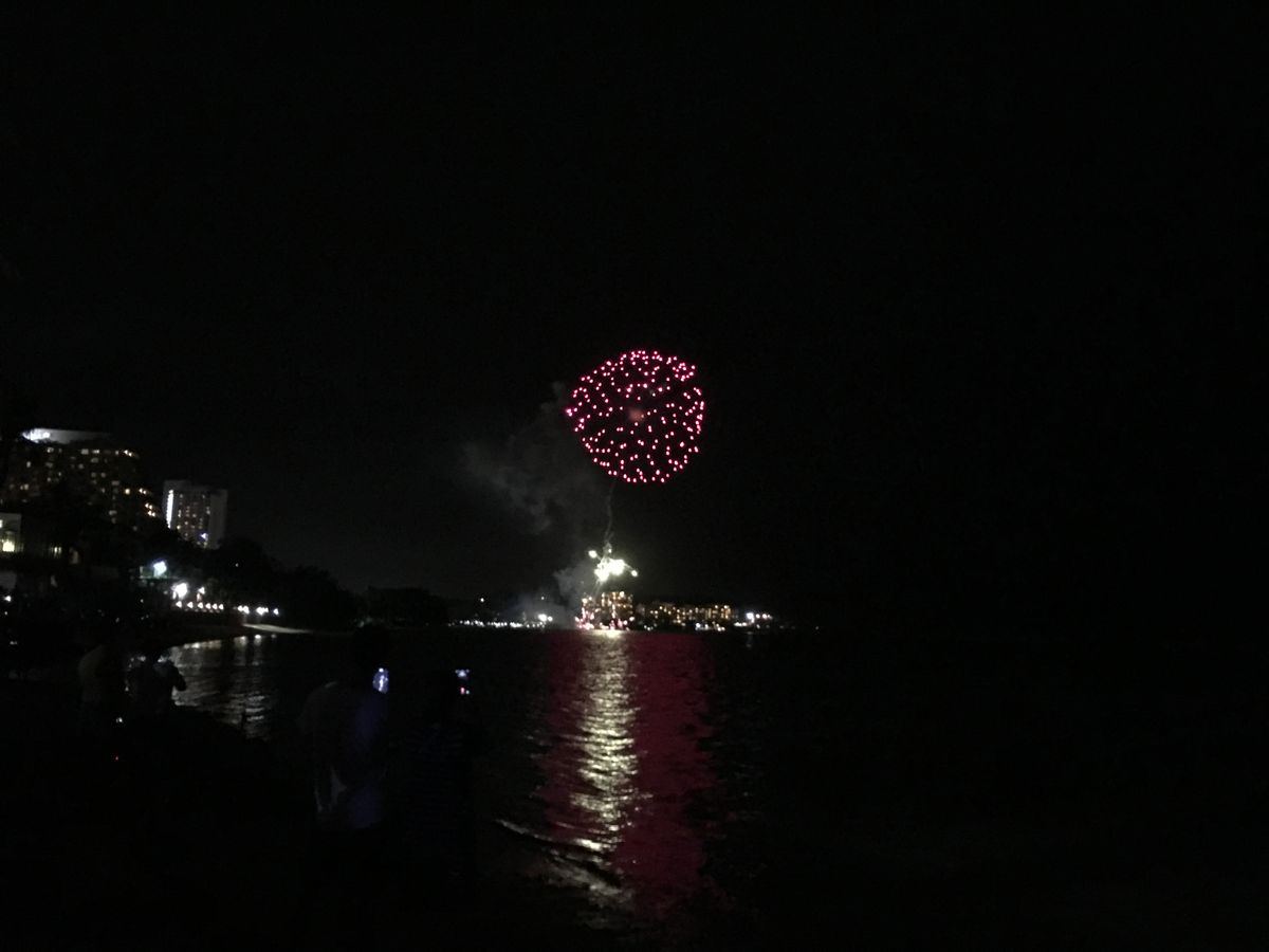 18時から開始のビュッフェで食べ放題だったのでお腹いっぱいになりました。味も良く家族みんな満足しました。1時間もするとお腹いっぱいで食べることもせずおしゃべりと携帯をいじっていました。21時からはカウントダウンパーティーのような感じで大音量で音楽が流れダンスしている人や歌を歌う人がいて食べ放題と飲み放題は続きました。とにかくスピーカーの近くは頭が痛くなるほどの大音量です!雨が降ってテントや屋根のあるところしかいられなかったので少しぎゅうぎゅうでした。だらだらと飲みながら時間を潰して1人だけ部屋に帰ることも出来ず携帯ばかりいじっていました。まわりもそんな人が多かったように見受けられました。部屋に帰る人も多数いました。みんなが楽しめるショーやイベントがあるわけではありませんでした。18時から24時までは食べて飲む以外は何をするわけでもなく過ごしましたが花火はたくさん上がって綺麗でした!お腹いっぱい食べた後は花火が上がるまではのんびり部屋でくつろいだ方が良かったように思います。万人に受け入れられるイベントではないように思います。