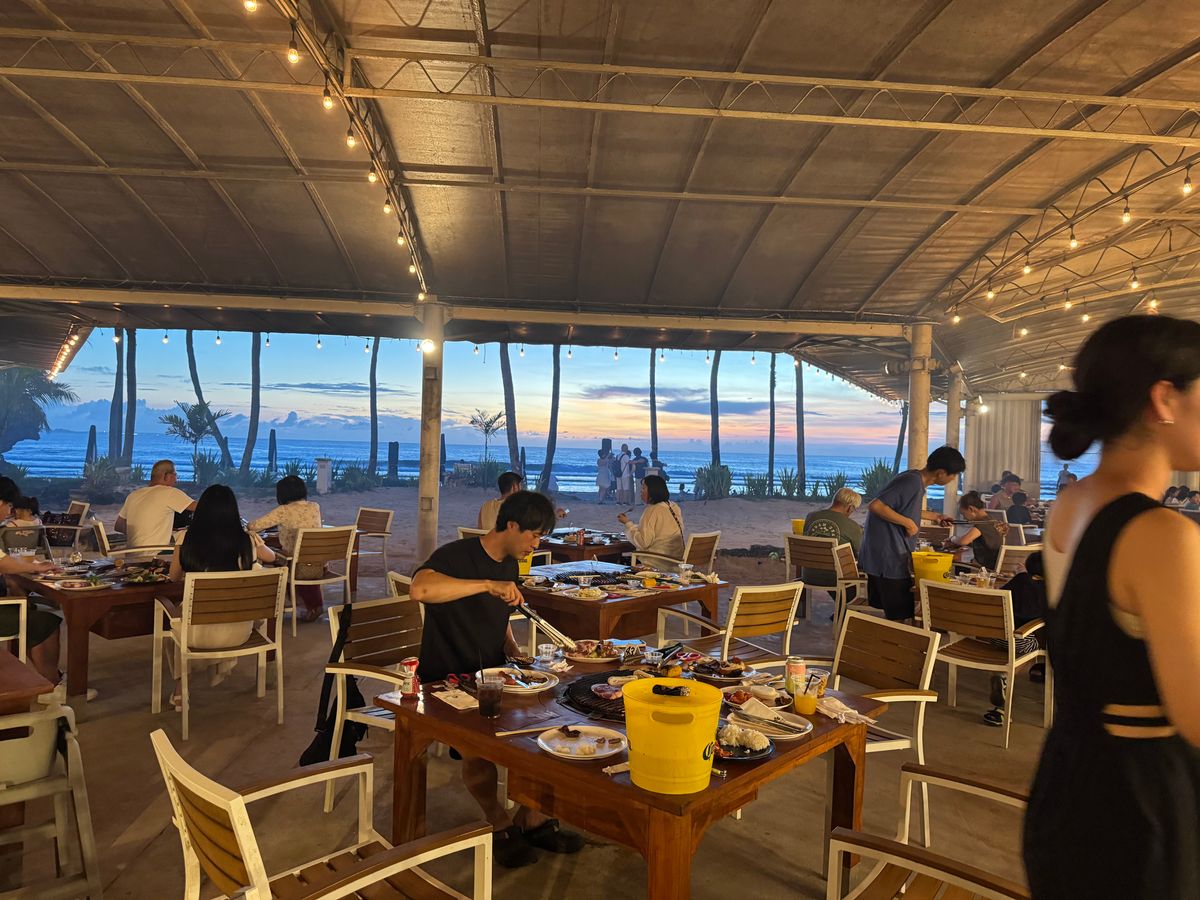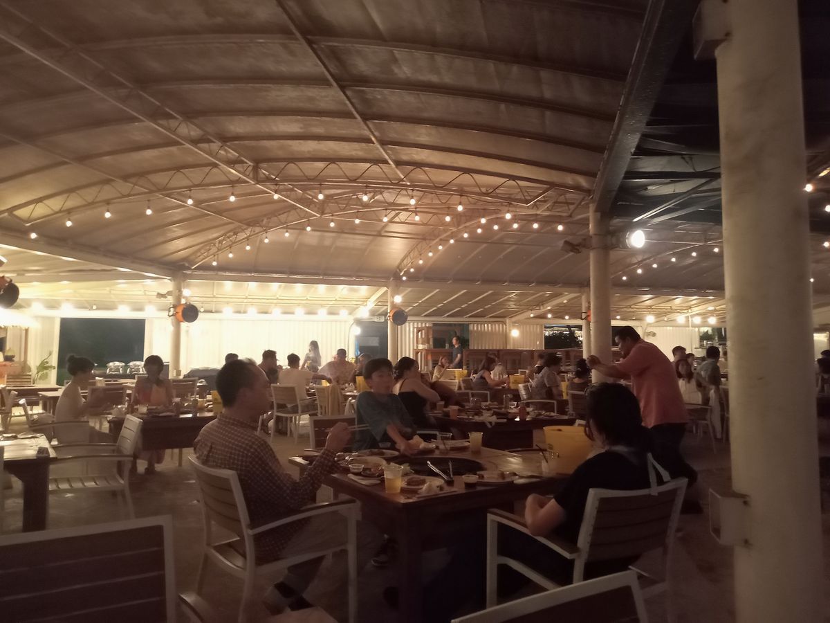 食事の肉おいしかった。シーフードはエビが小さくて残念。途中からスコールがあったけど屋根があり全く問題ありませんでした。