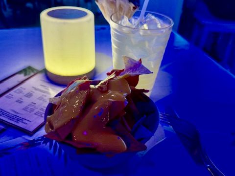 日替わりミニおつまみ(この日はコーンチップスにチーズソース掛け)と、専用のドリンクメニュ―から2品のセットです(ジュース4種・炭酸3種とビール2種、グラスワイン赤・白やカクテル3種からチョイス)。