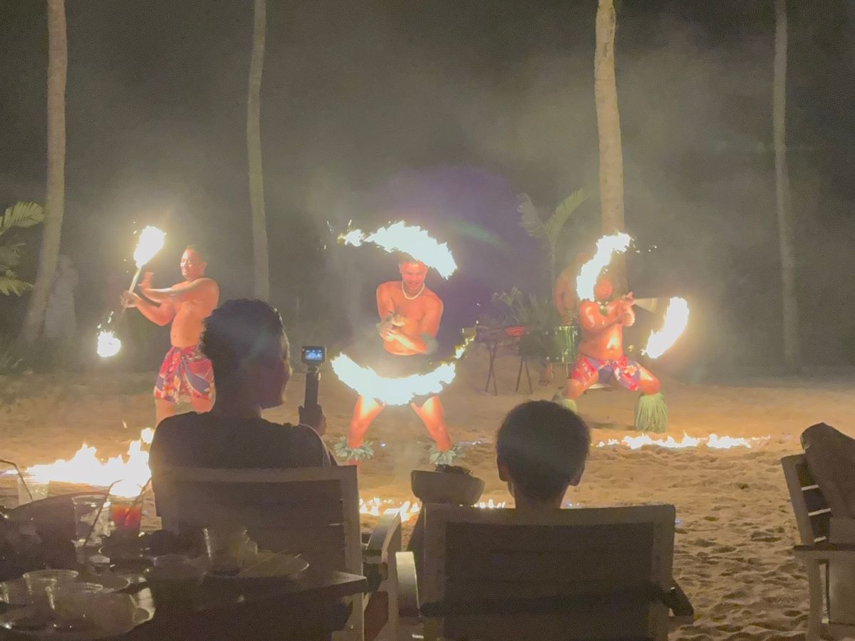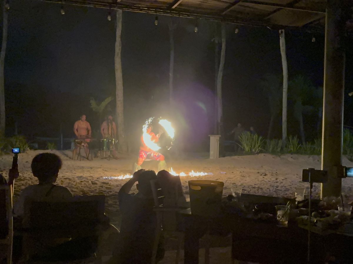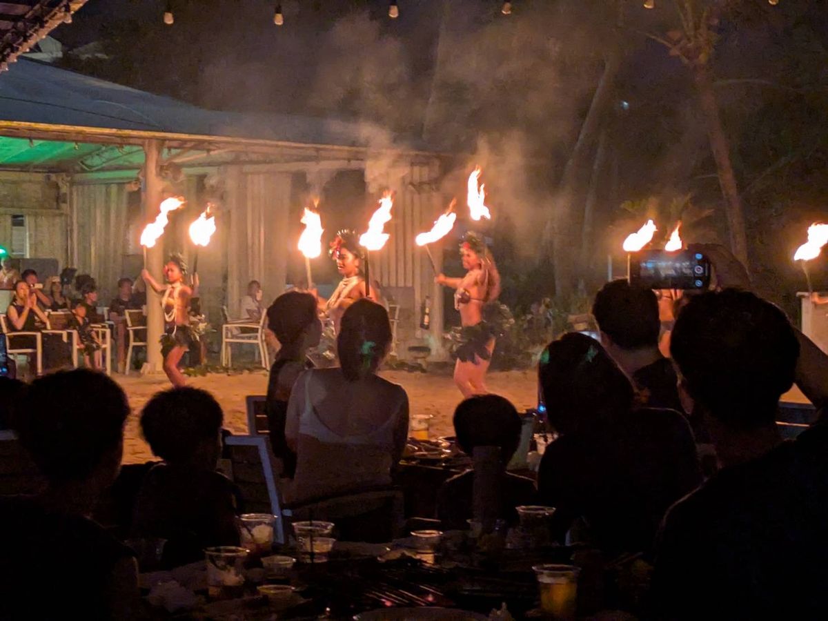 海辺で、分厚いお肉やソーセージを豪快に焼くBBQは貴重な体験で楽しかったです。その後ダンスショーは太鼓や歌で盛り上がり、ファイヤーダンスは子供たちも凄いと驚いていました。