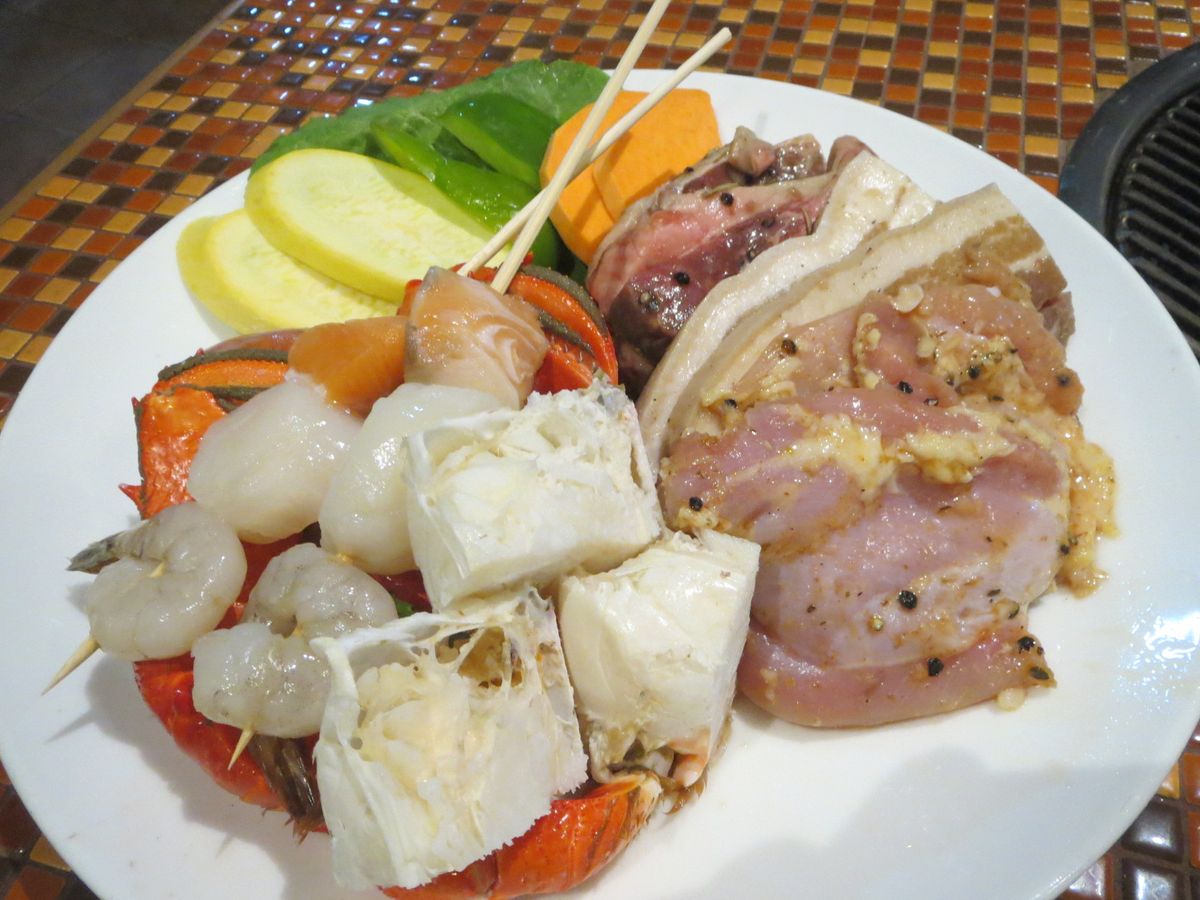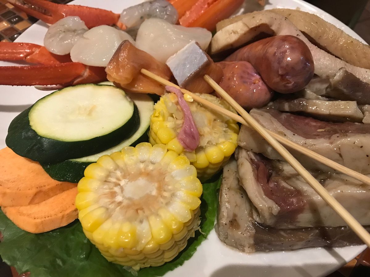 メニューについてお肉・ソーセージ・カニ爪・海鮮串・野菜少々は1人分の量が決まっており、大きな皿で準備してくれます。