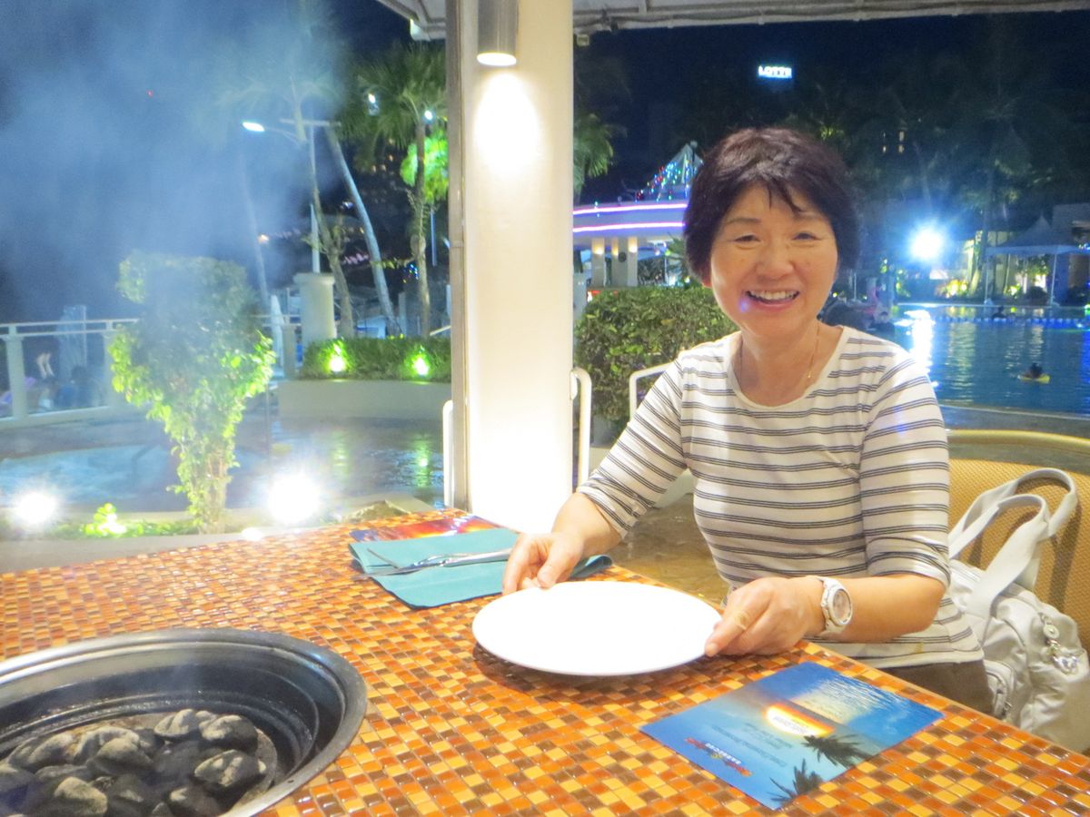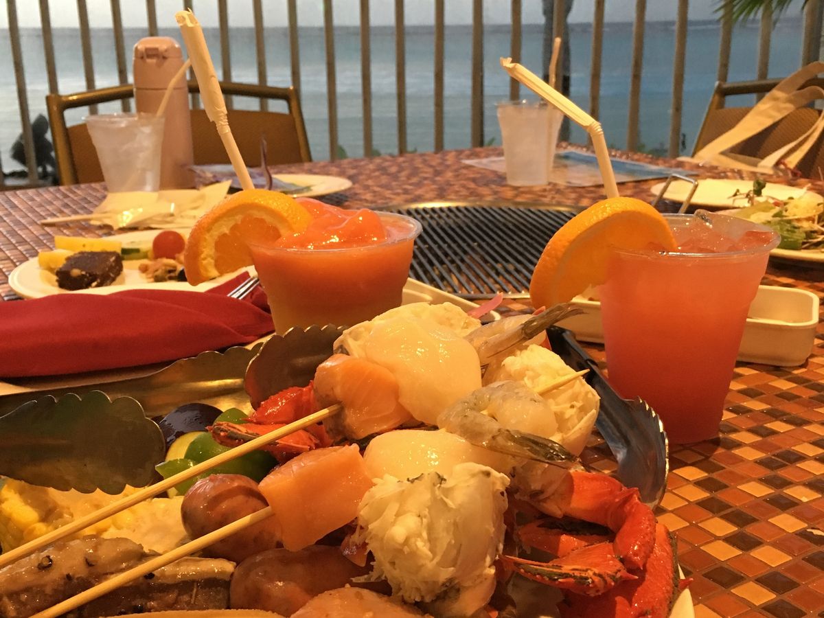 余裕を持ってサンセットを見たかったので、送迎は頼まず現地まで自分達で行きました。予約の時間の30分前位に着いたので、目の前のビーチで少し遊んだり写真を撮ったりなどしてから食事を始めました。スタンダードコースでしたが肉の量は十分、他にも魚介、野菜とありましたのでブュッフェの料理は手をつけなくてもいい位でした (ちなみに183cm、75kg)。ソフトドリンク、ビールも飲み放題でキンキンに冷えてたし、ロケーションも最高だし、この料金でって考えたら申し分ないと思いました!