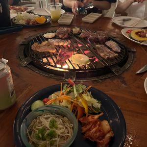 大きな牛肉(ロース?)2枚、リブ2枚、魚1枚、エビ1尾、チキン1枚、ソーセージ1本、野菜(玉ねぎ、パプリカ、カボチャ)が1人分。5歳の子ども用プレートは、全部1ずつくらいずつプラスとうもろこし1でした。加えて、サラダバーが(ライス、キムチ、生野菜サラダ、とうもろこし、蒸しじゃがいも?(じゃがいもとさつまいもの掛け合わせのようないも)、そうめん、フルーツなど)ありました。 お肉を食べまくりましたが、BBQは食べきれなかったです。他の場所で食べると野菜があまり取れないので、生野菜サラダが嬉しかったです。飲み物は別料金でした。