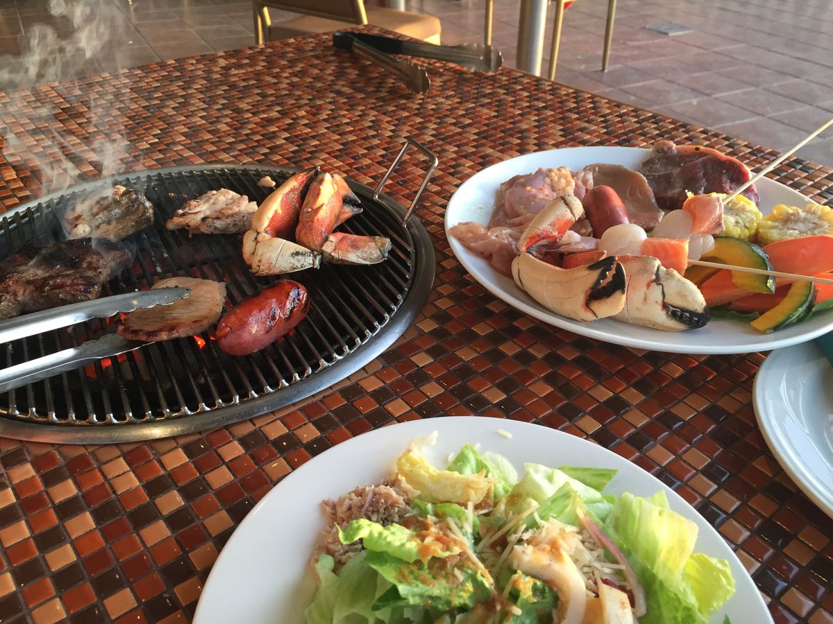 到着日の夜に行ったので、日の入り見れませんでした。テラスなので、バーベキューの熱さもあって汗だくです。