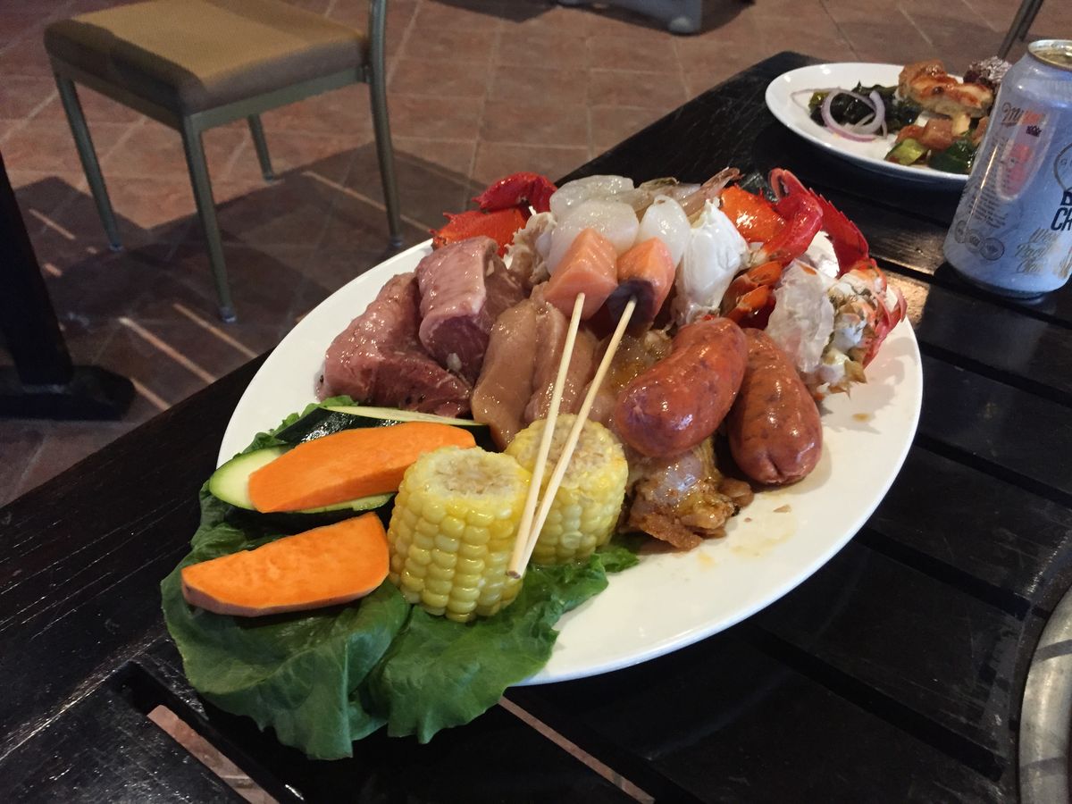牛肉と鶏肉とロブスターとシュリンプのコースにしましたがボリュームがすごい!特製ソースをつけて食べます。