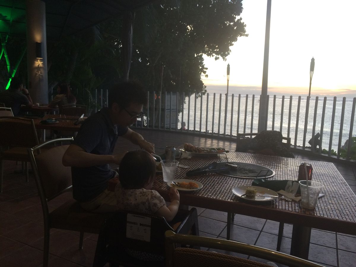 今回三世代の家族旅行のフィナーレにこちらを予約しました。雲が多かったものの、ギリギリ夕焼けも見れ、さっさと食べ終わる子供たちはそのままビーチへ遊びに行けます。