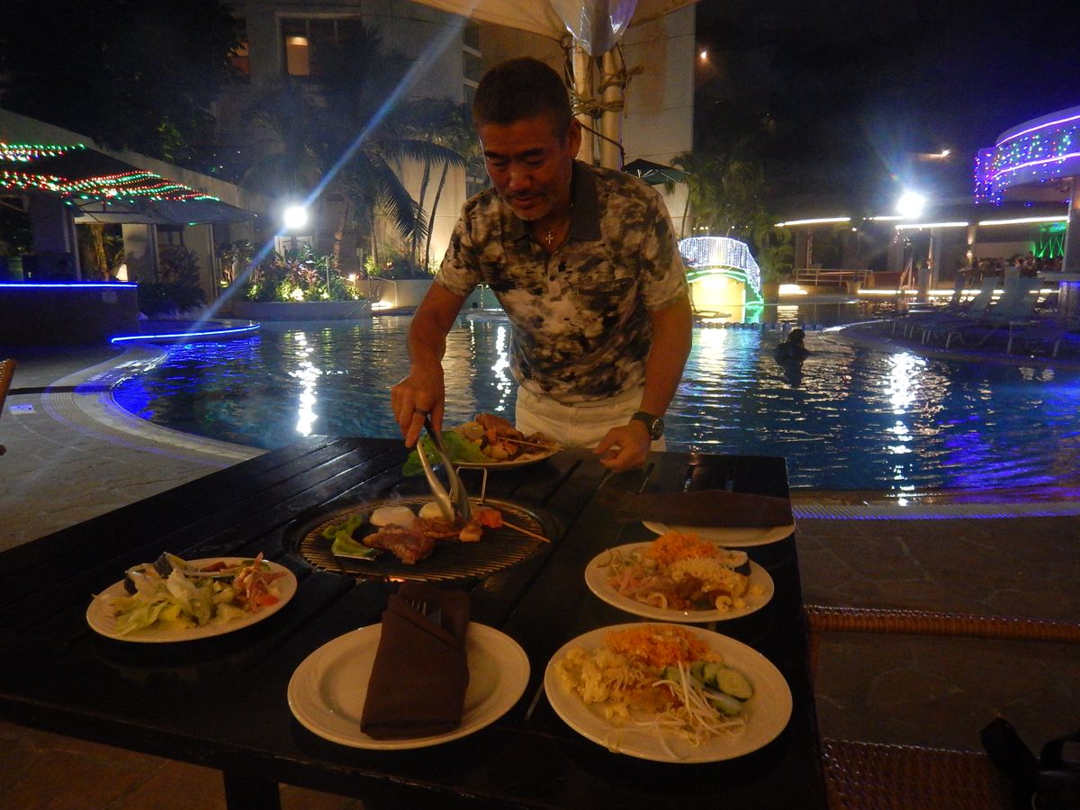 まず雰囲気はプールサイドでのバーベキューにしては、華やかさがたりまい。たしかにイルミネーション的な電飾はあるが、ハッキリ言って感動は無い。ただ周りが少し明るくなったかな(普通に照明的な感覚でしかない)そして料理は、あくまでも極めて個人的な感想としては中の下です。では、どのようなレストランと比較して判断したかというと、プロア、テーブル35、こあBBQ、ローンスター、メスクラレストラン、フィッシュアイ、セイルズ…。少なくとも以上のレストランの中では足下にも及ばないクオリティと感じました。例えば同じ価格帯ではプロアの方が、味、品質、サービス、どれをとってもレベルは断然上です。なんだろう…すごく損した気分です。おそらく料理が口に合わなかったからでしょうけど…。特にチキンはトリ臭くて(分かりますかね?トリ臭いというの…)食べることができなかった。少なくとも品質向上を強く望みます。