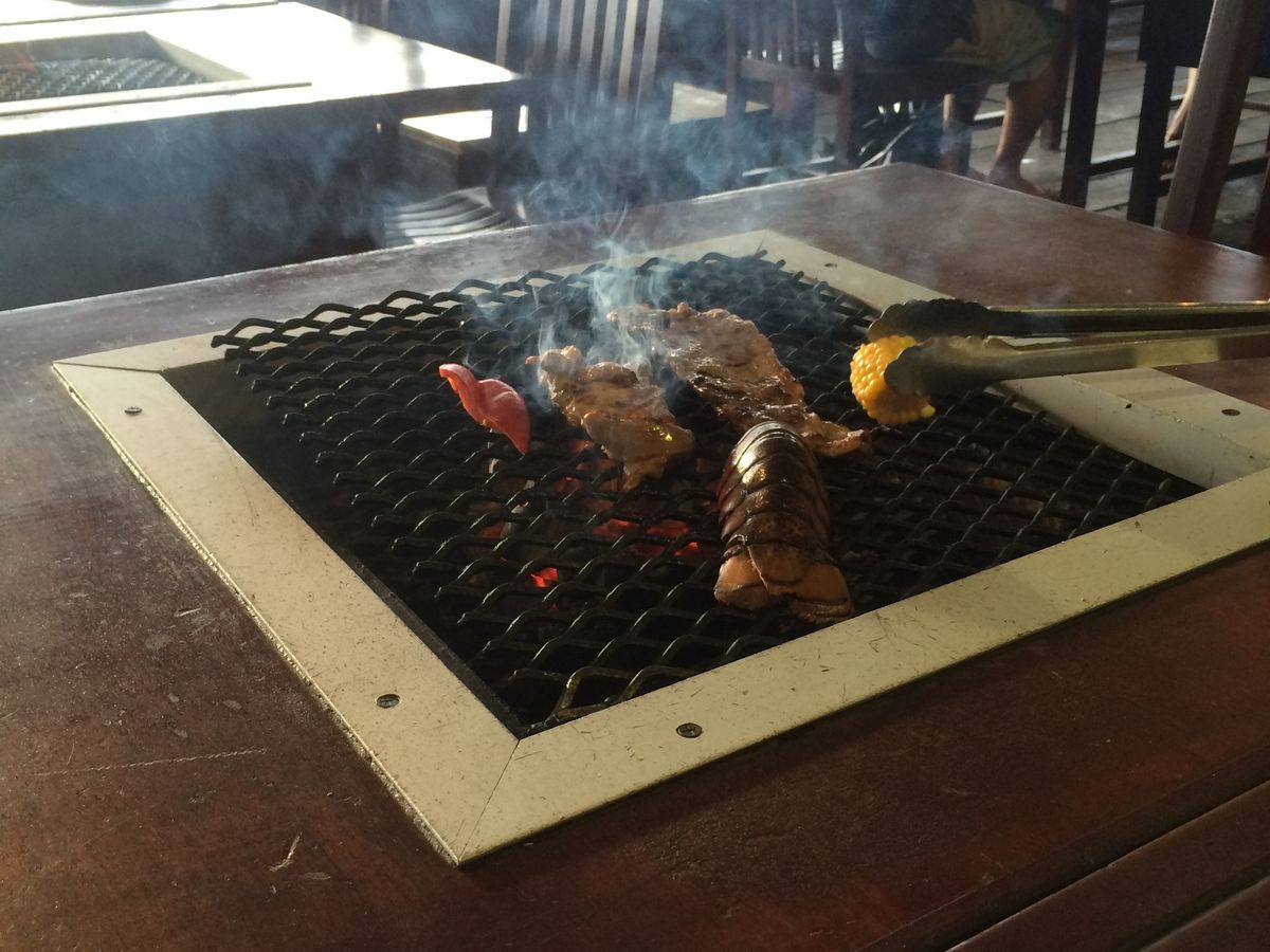 モックモクの煙の中、自分たちで好きなように焼いて食べられるBBQは楽しい。ビール飲み放題。ちょっと飲むと次々注いでくるからお腹いっぱい(笑)お食事の量も日本人なら十分満足できるくらいでしたよ。