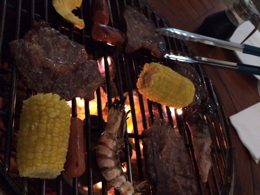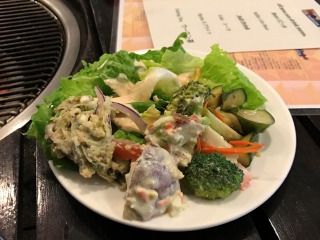 良い席を予約してくれるのはありがたいが、そもそもBBQに不慣れだと、肉やエビをどう焼いて良いものか分からない。BBQのやり方を少し勉強していった方が良いですね。肉もエビも鉄板の上に置いたからと言って、すぐに火が通るものでもなく、すさまじい煙もくもくの中、肉やエビと格闘する感じで食べます。量も決して多くはないです。少し多めに頼んだ方が良いですね。追加ができるって訳でもなかったように思います。味もついていないので、適当に塩をふって食べます。