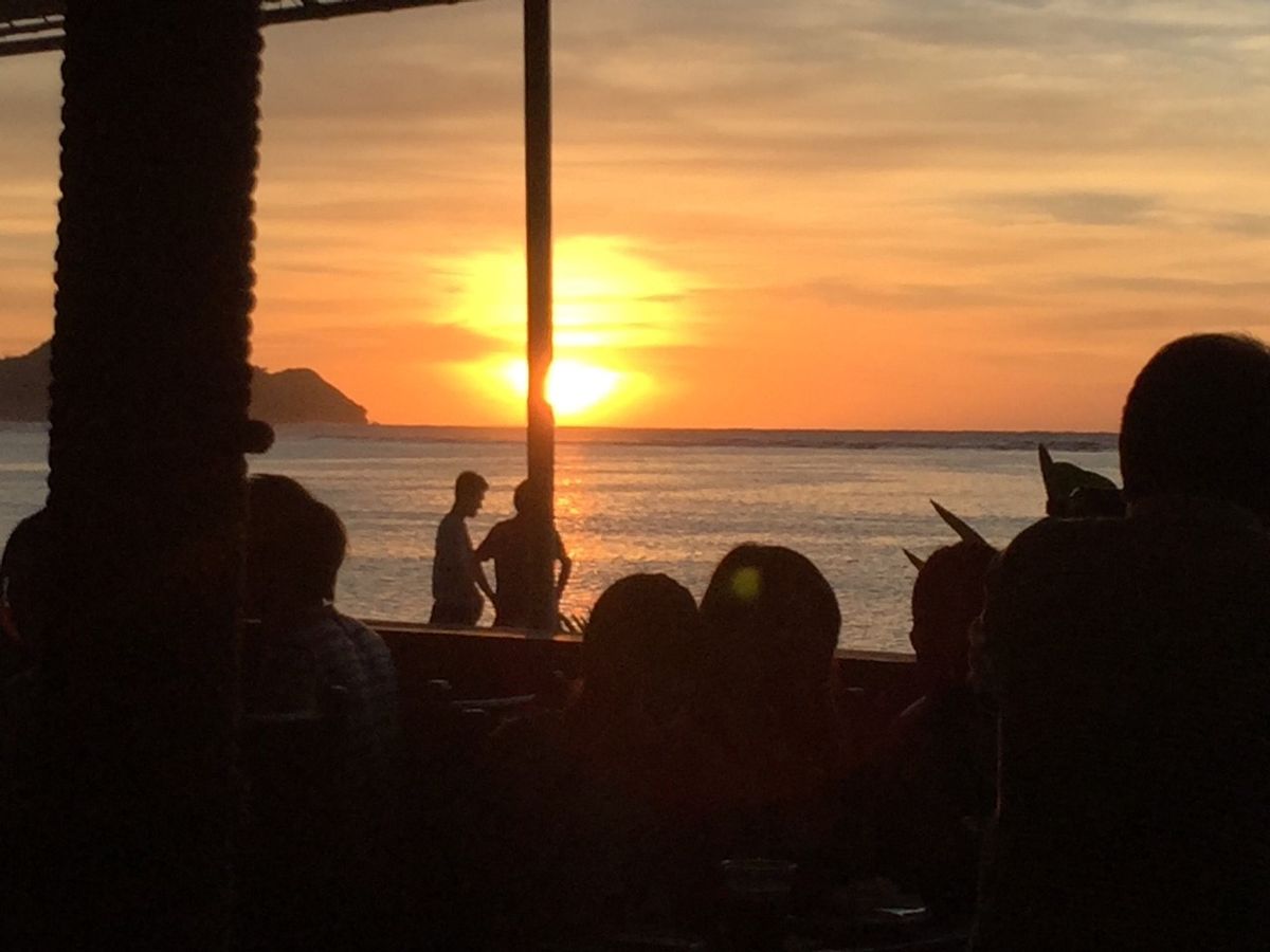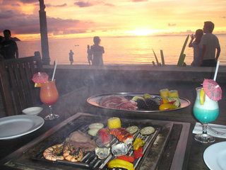 食事はBBQ(食べ放題)、プールサイドテラス、沈む夕日を見ながら、松明?(トーチ的な(笑))