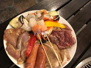 BBQのボリュームは写真の物で2名分ですが想像していたよりもボリュームがあり、こちらの他にサラダや前菜、焼き野菜、巻き寿司、マカロニ、スープ、デザートのケーキ、アイスなどがあるので男性でも満腹になります。