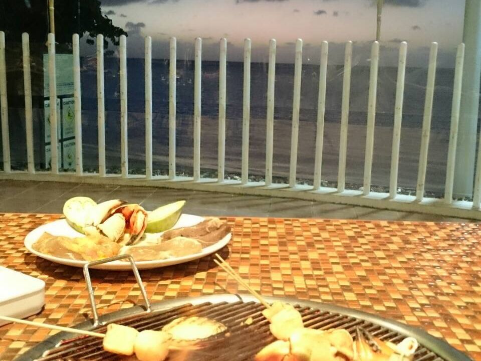18:00から予約しました。17:30にホテルに迎えが来てくれ、ホテルに着くとベルボーイがエレベーターに案内してくれ、バーベキューを行うテラス席もエレベーターを降りてすぐだったので迷わず行けました!18:00前に着いてしまったので、しばらく目の前のプライベートビーチで写真を撮ったり暇つぶしできました!だんだん夕焼けてきて少し曇ってはいましたがキレイでした。18:00になり、テラスに向かうとすでにテーブンのグリルに火が付いていてすぐに肉や海鮮が焼けました!!肉の種類は豚のロース、鶏肉、牛肉と、ソーセージ。海鮮はエビホタテサーモンの串、蟹がそれぞれ2人分でした。それと、ブッフェ形式で焼き野菜、サラダや巻き寿司、レッドライス、ペンネ、蒸した野菜、デザート、アイスたくさんありました!お肉、海鮮は量もあったので最後は少し残してしまいました。。ブッフェはあまり欲張らずお肉を最初に食べていれば良かったなと少し後悔。。ドリンクはアルコールはびーるのみ。ソフトドリンクはコーラやウーロン茶などありました!ゆっくりできて満足です!