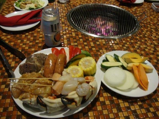 肉は鶏・豚・牛、またカニやイカ等があり、それ以外にも、ビュッフェスタイルでサラダや巻き寿司、フルーツ、ガトーショコラをいただきました。パイナップルは甘くておいしかったです。肉をつけるソースはは現地のオリジナルバーベキューソース、ケチャップ、すっぱいタレ?のようなものがあり、ケチャップ以外は私の口にはあまり合いませんでした。