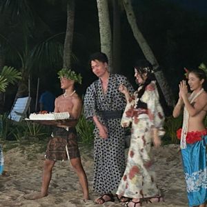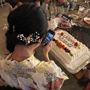 グアムで娘の結婚式があり、その夜に皆んなでバーベキューを楽しみました。サプライズでケーキを準備していただき、あと孫の1歳の誕生日のサプライズケーキもお願いしました。名前を呼ばれて娘夫婦は、びっくりしなから前でケーキを渡され 無茶振りのキス(笑)