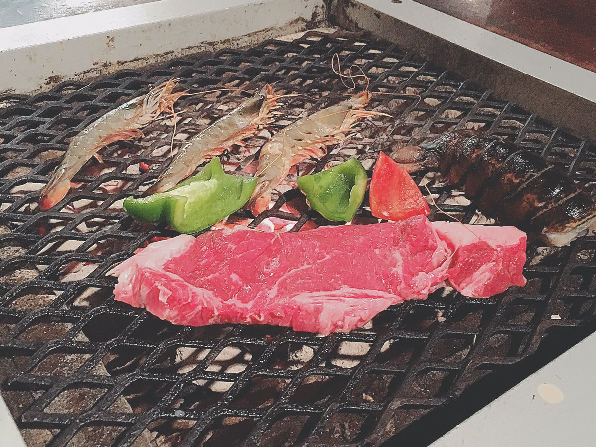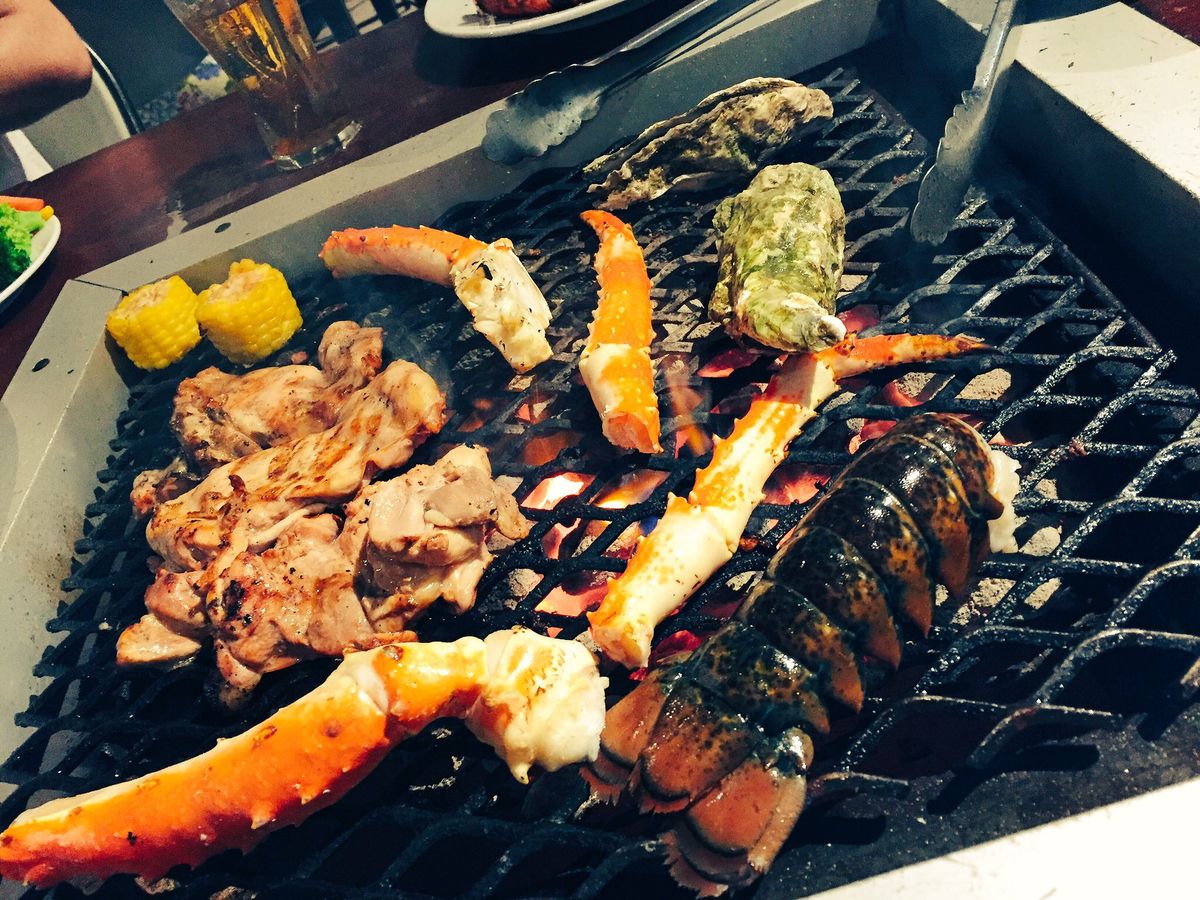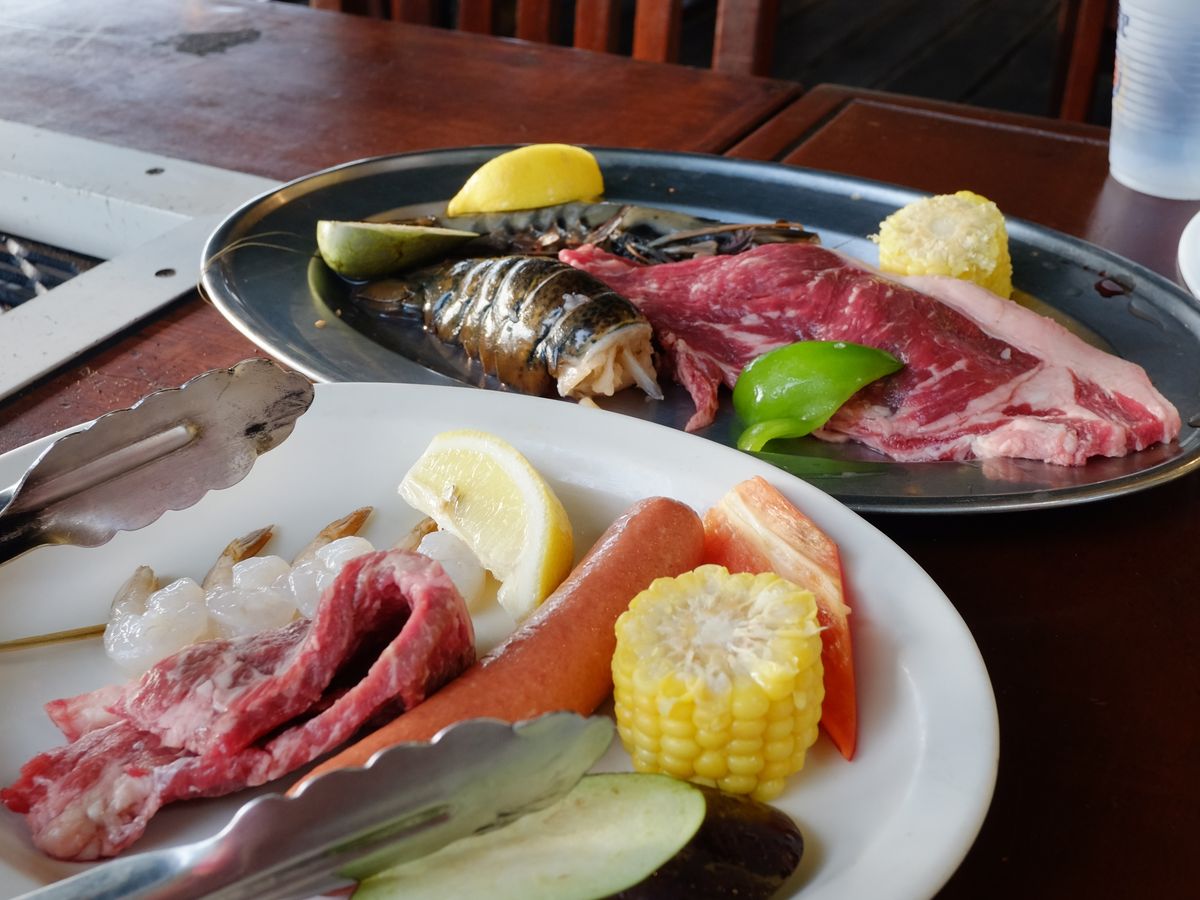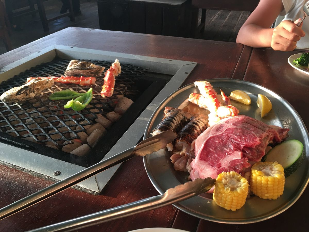親子3人でシーフードを頼みました。小学6年生の娘も大人で頼みましたが正解でした。味付けは塩と醤油と胡椒しかないので、気になる人はタレを持参した方が良いかも。テラス席でしたので、とにかく暑いし、焼いている時の煙も風向きによっては凄いかも。飲み放題のドリンクは注ぎに来てくれるので助かりますが、飲み過ぎには注意。それでも食事しながら陽が沈むのを見られるのは良かったです。ウェットシートとタオルと扇子を持って行きましたが正解でした。